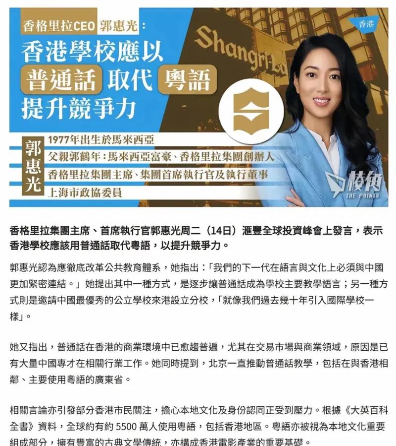 2026 年 4 月 14 日,香格里拉集团主席、首席执行官郭惠光(马来西亚华裔、香格里拉集团创始人郭鹤年之女、上海市政协委员)在汇丰全球投资峰会上公开发言,提议香港改革公共教育体系,应以普通话逐步取代粤语作为学校主要教学语言,以此加强香港下一代与内地的语言文化联结、提升香港整体竞争力,同时建议效仿过往引入国际学校的模式,邀请内地顶尖公立名校来港设立分校;她指出普通话现已高度普及于香港金融商业领域,且紧邻香港、本土以粤语为主的广东省也在官方推动普通话教学。该言论随即在香港引发广泛热议与争议,粤语作为全球约 5500 万人使用的语言,是香港本土文化、古典文学传统及香港电影产业的核心根基,也是香港市民本土身份认同的重要象征,大量香港民众担忧本地语言文化与身份认同会因此受到冲击,同时也对身为外籍人士的郭惠光直接干预香港本地教育语言政策提出了质疑。