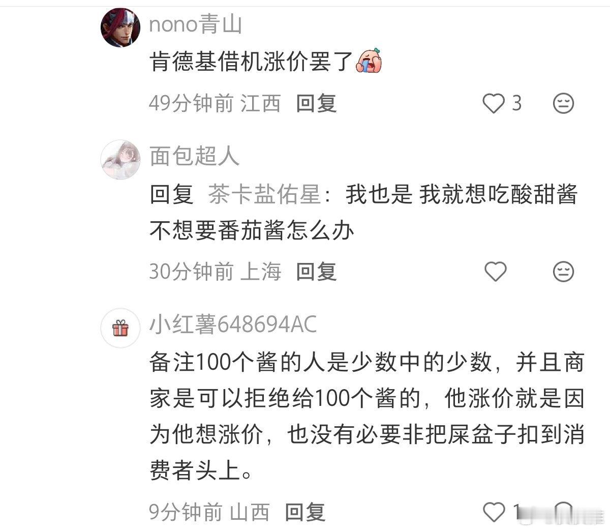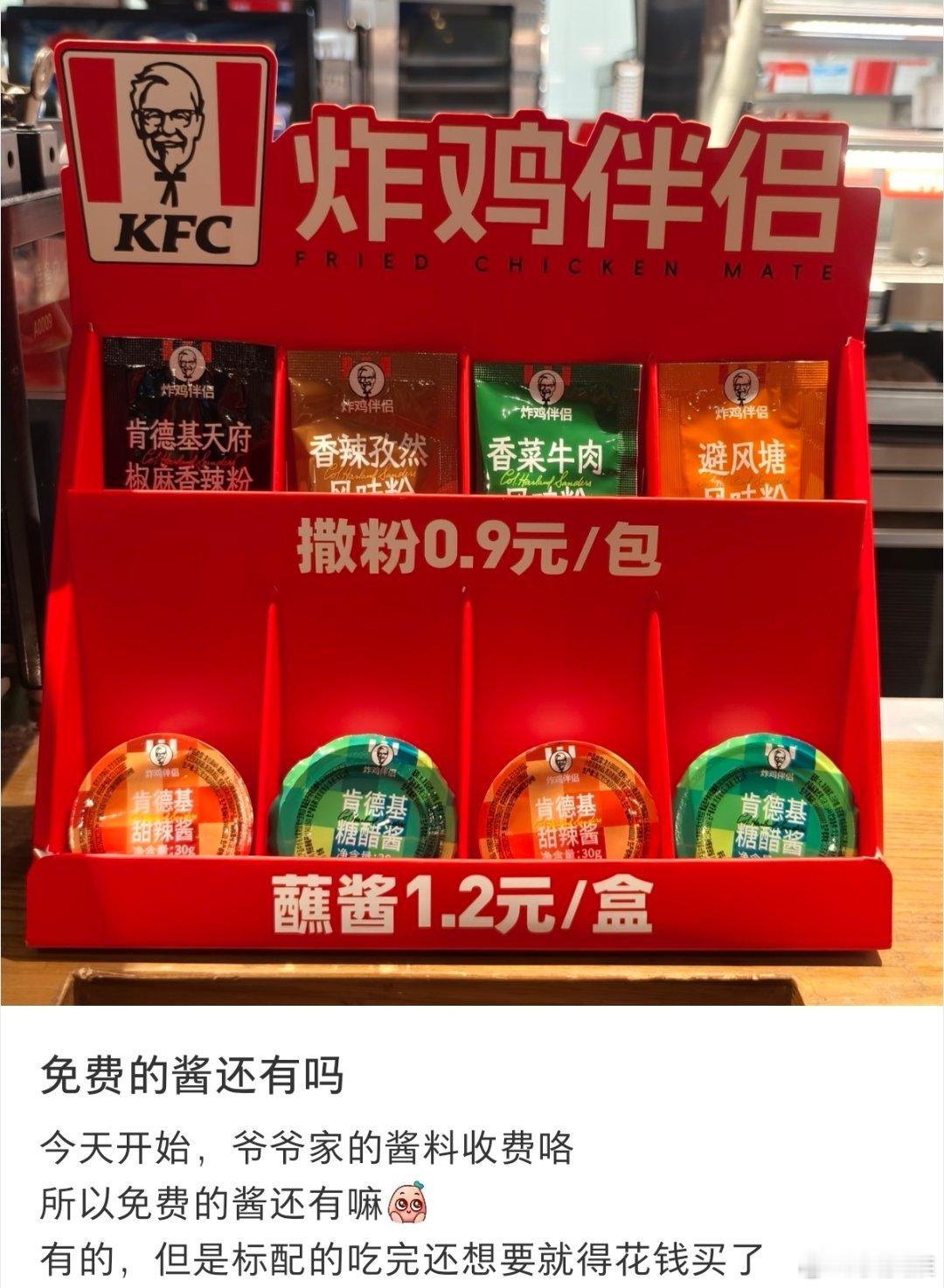 肯德基多要酱收费今天开始,肯德基的酱料开始收费了,网友评论:挺好,备注100个酱的人把所有人堵死了;也有网友认为这是肯德基借机涨价罢了。科技先锋官