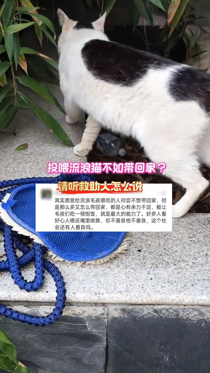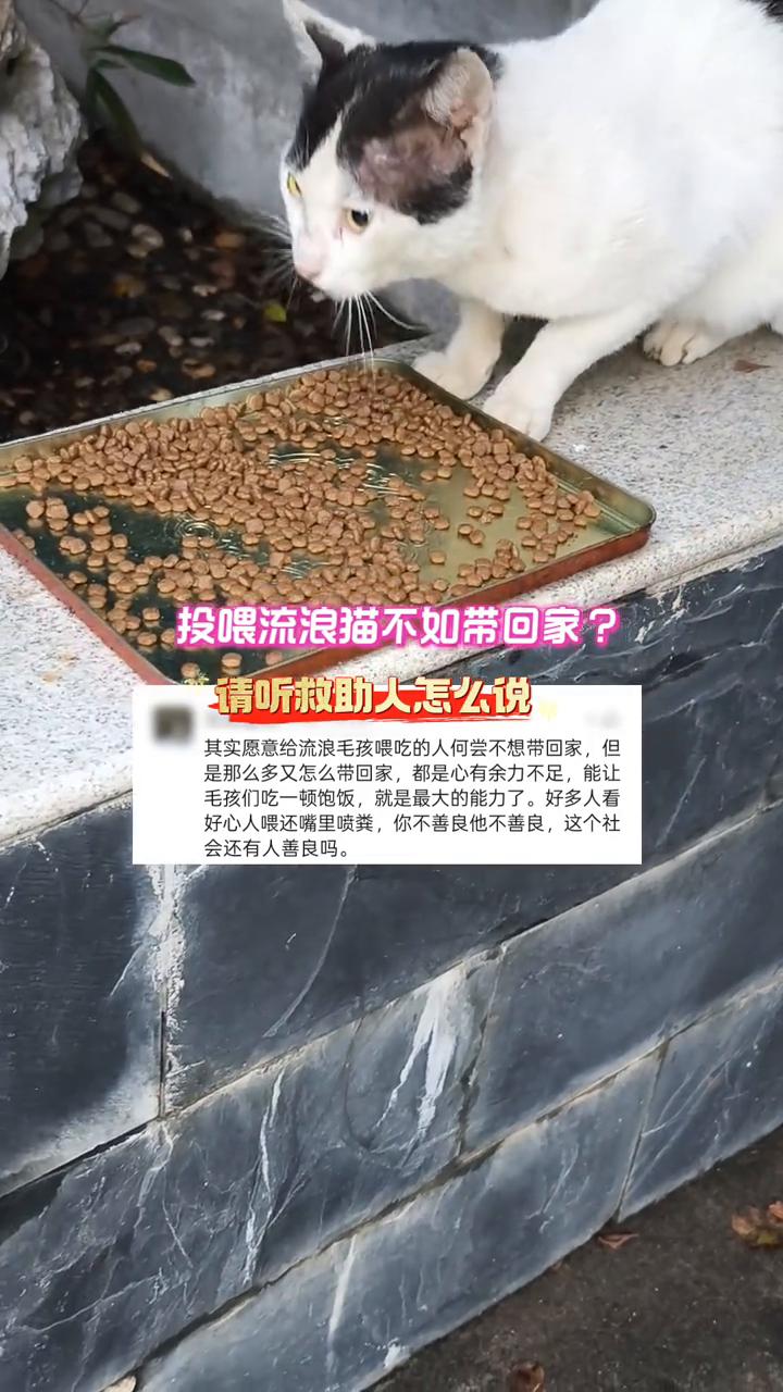 投喂流浪猫不如带回家?请听救助人怎么说。 其实愿意给流浪毛孩喂吃的人何尝不想带回家,但是那么多又怎么带回家,都是心有余力不足,能让毛孩们吃一顿饱饭就是最大的能力了。好多人看好心人喂还嘴里喷粪,你不善良他不善良,这个社会还有人善良吗?