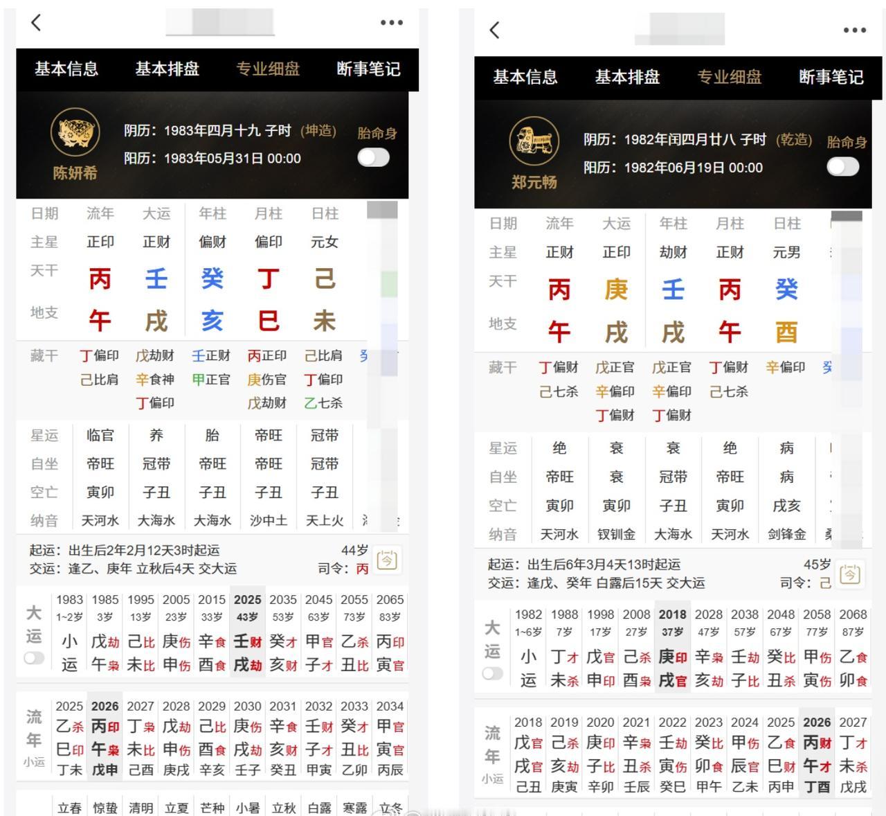 陈妍希X郑元畅合盘 陈妍希 八 字:癸亥 丁巳 己未 郑元畅 八 字:壬戌 丙午 癸酉 前三柱来看,我觉得他俩处对象不是很配啊 在两人关系中,最开始应该是男方对女方好感度主动性是比较强的,更愿意主动交友。 郑元畅的盘是财男,比较现实,喜欢成熟有能力的姐姐类型,能成为他的港湾。 所以也容易妇女之友,好闺闺,和女性好友关系都比较近。 陈妍希是印比女,配得感成熟感很高,事业能力很不错,深受财男喜欢。 男方日元是女方的财,女方日元是男方的杀,这段关系陈妍希主导型更强掌控更强,男方臣服女方甘愿左右相扶。 但陈妍希更需要势均力敌,平等互伴的另一半,很需要另一半和自己圈子相同,有共鸣感。 目前来看,俩人生活轨道会有一些差距啦 而且两人五行并不互旺,陈妍希和郑元畅都需要金水,结为夫妻的话生活也不是很和谐,不互补 错付概率很高。 目前来看陈妍希应该不会轻易进入婚姻啦 红尘走一遭也许会改变既定选择,look look年下弟弟maybe?