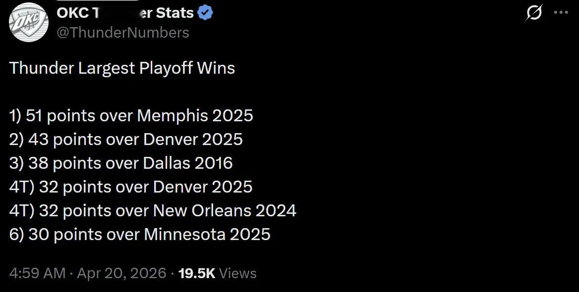 雷霆季后赛最大净胜分排行:最多是去年首轮G1净胜灰熊51分,昨天净胜太阳35分排在第四名。对了,51分就是一年前的今天。