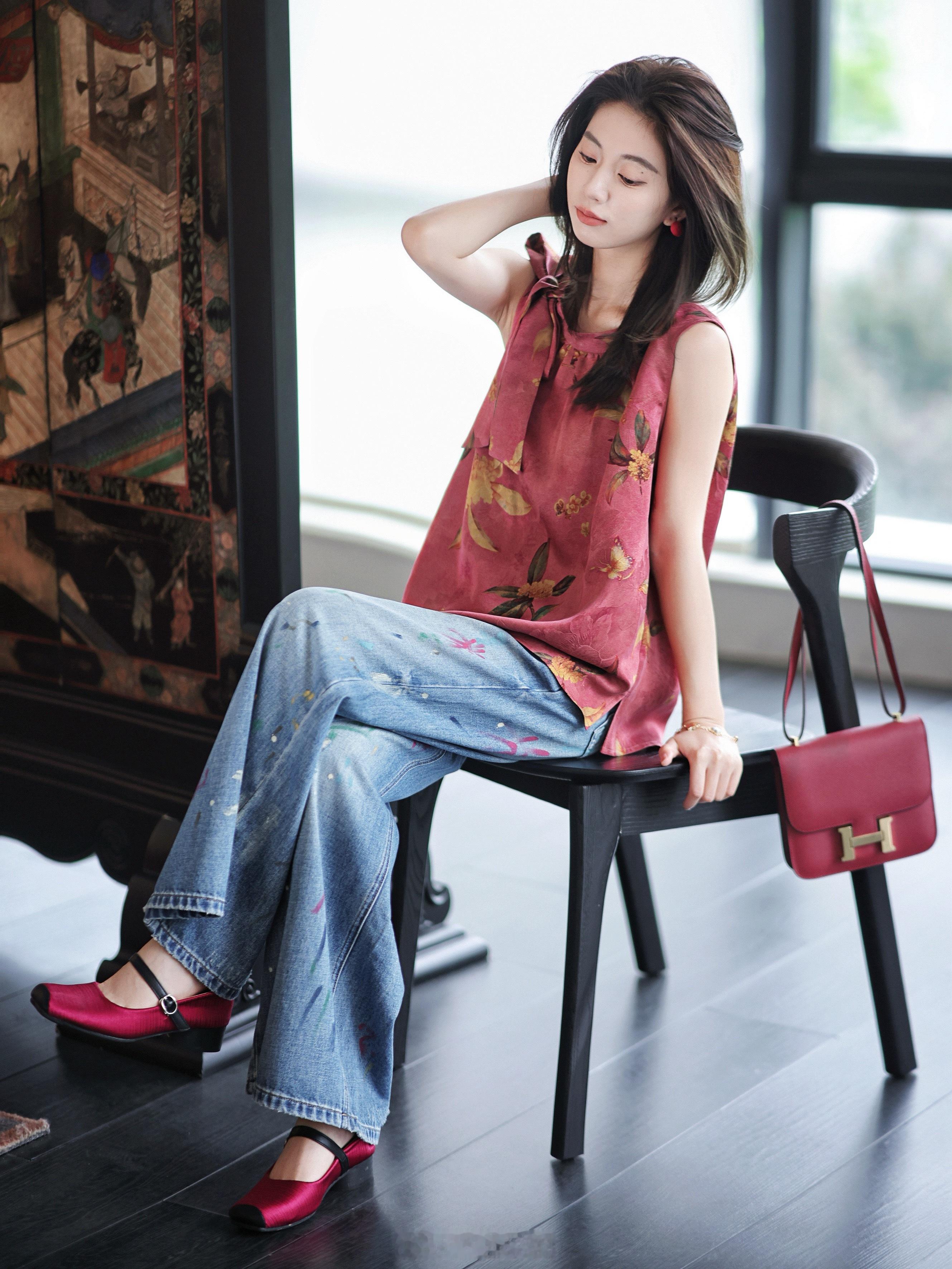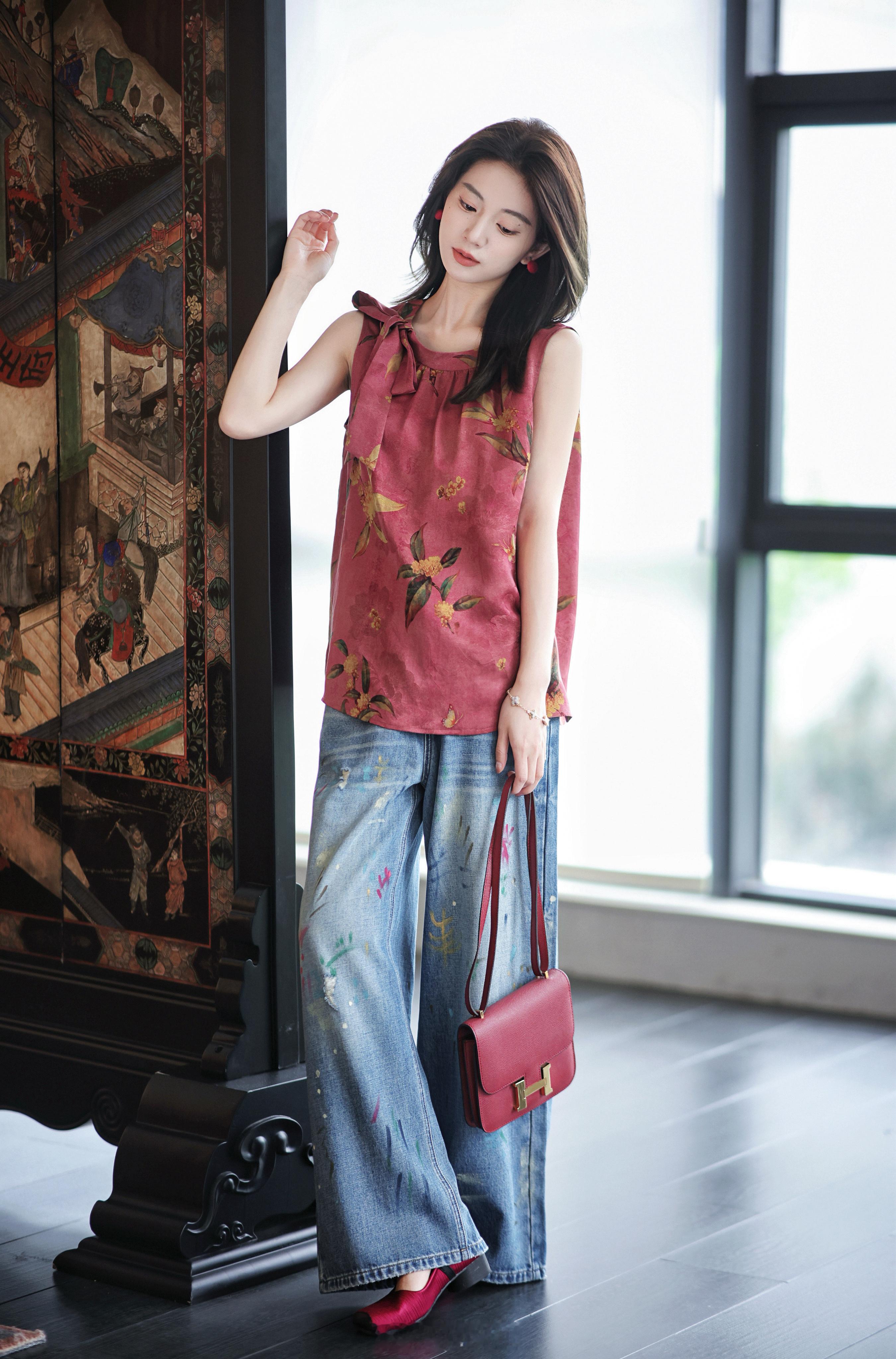 非遗红云纱+金蕊印花 那很贵气了!100真丝小衫 还有蝴蝶结领口点缀 明媚复古又日常 升温天就穿这件啦~