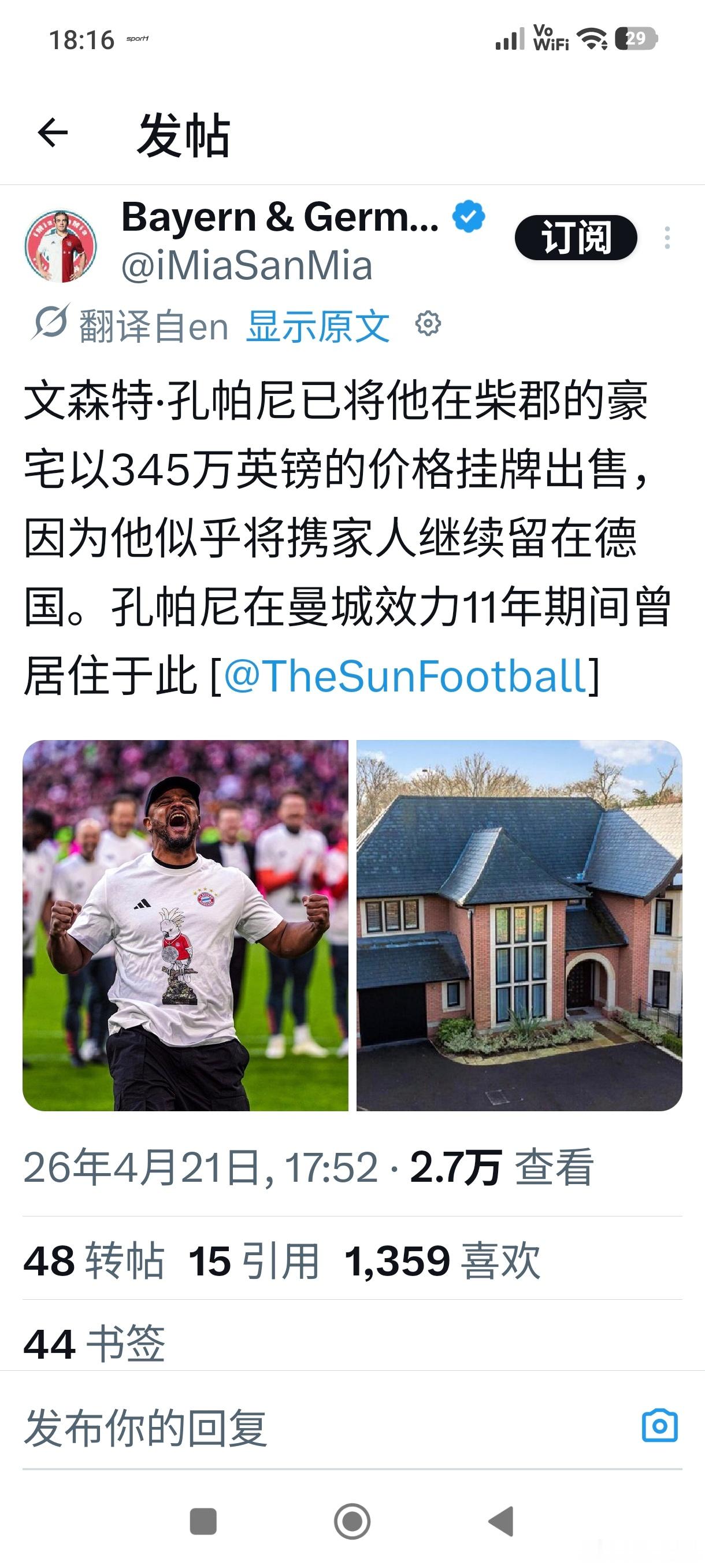 [孔帕尼挂牌出售英国豪宅345万英镑]拜仁