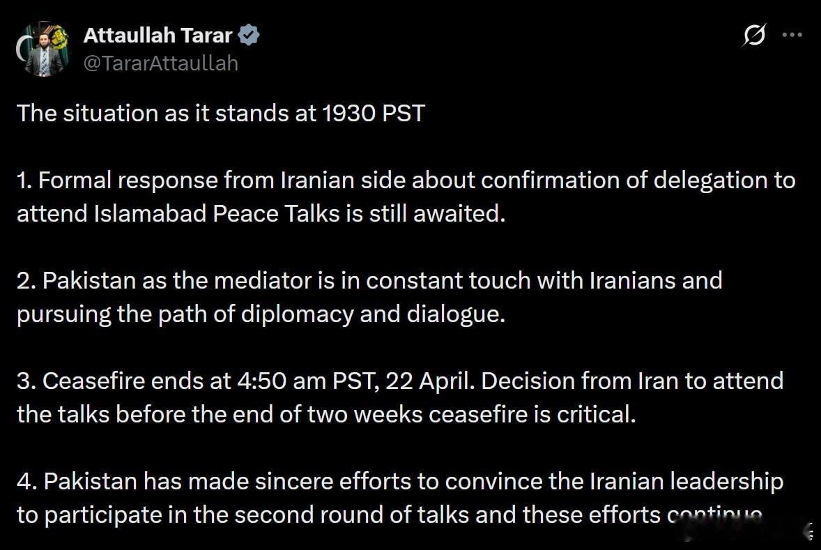 停火协议将于太平洋标准时间4月22日凌晨4点50分结束。伊朗在停火结束前决定是否参加和谈至关重要。