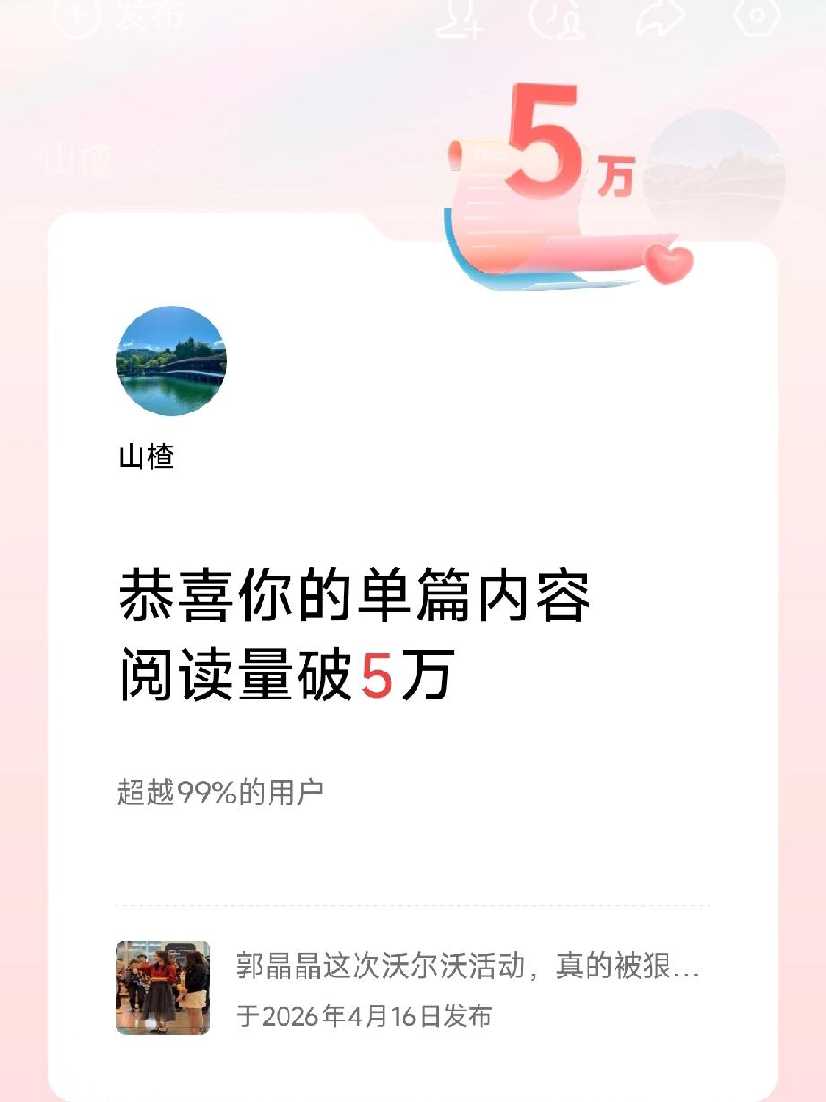 郭晶晶沃尔沃活动这篇文章,居然直接破5万阅读了! 刚收到平台通知的时候,真是太高兴了,居然还超越了平台99%的用户! 本来只是随手分享的真实感受,没想到能被这么多朋友看到,太感谢大家的捧场了! 这份惊喜直接给我加满了动力,以后会继续分享有意思的内容,不辜负大家的喜欢。