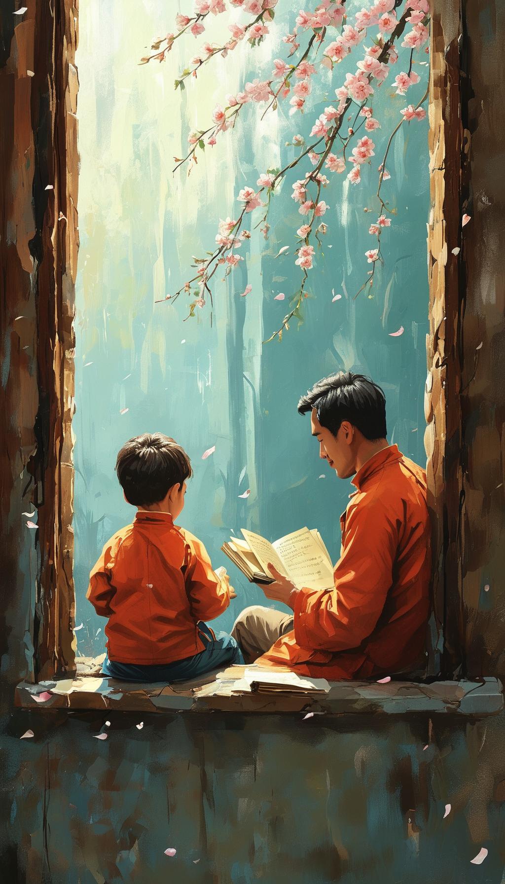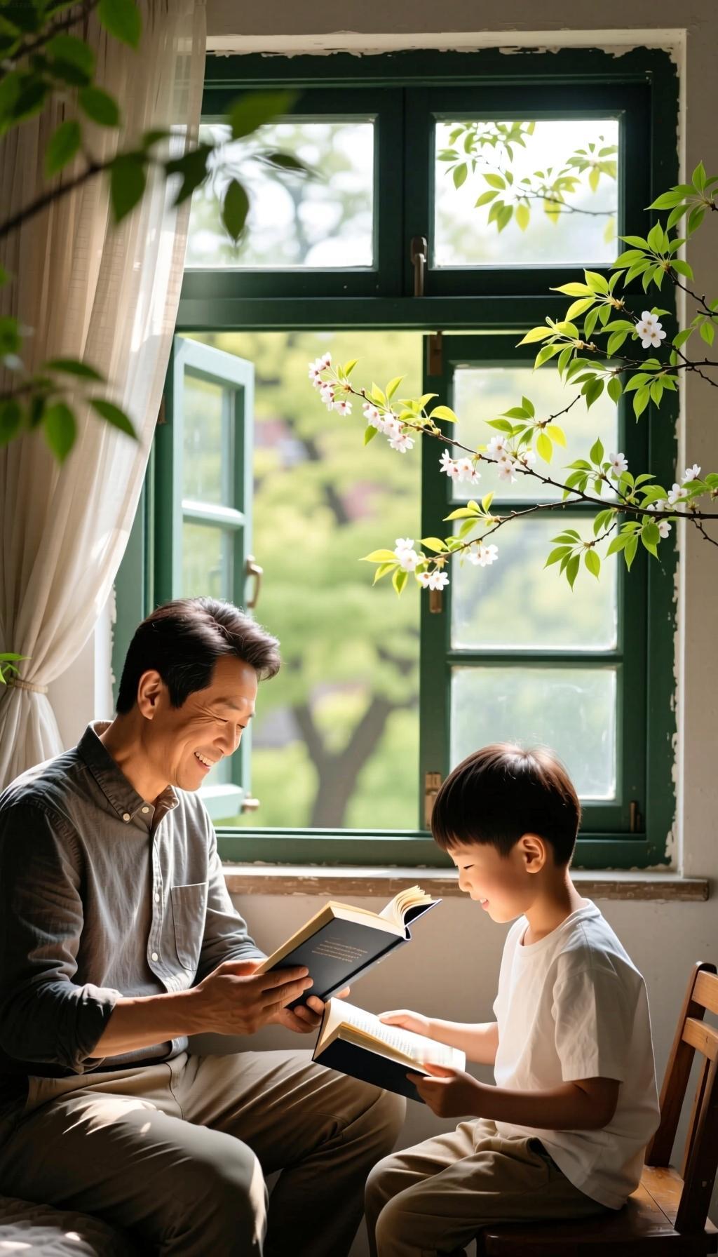 正是亲子读书时 父子共读(七绝) 人间最美四月天, 窗畔书香父子连。 一卷圣贤同细品, 春风伴读意绵绵。 四月共读 人间最美四月天, 风和日暖好流年。 父子同坐翻书卷, 书香漫过小窗前。