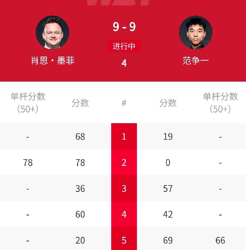 打疯了!9-9、8-8、7-7,中国名将范争一对攻世锦赛冠军“魔术师”墨菲!北京时间4月22日凌晨,正在进行的2026年斯诺克世锦赛第一轮第二阶段的焦点中,欧洲大师赛冠军范争一打出了非常霸气的表现,他在落后的情况下,展现出了一颗大心脏,一路顽强追分。此役第一阶段,范争一以4-5的比分落后墨菲。进入第二阶段,范争一开启反击模式,面对4-5、6-7的局面,与墨菲展开对攻。第十四局以7-7逼平墨菲。接下来的比赛中,又以8-8追平比分。第十七局,墨菲9-8赢得赛点,范争一在第十八局顽强挽救赛点,比分追成9-9。那么,就让我们期待范争一的大逆转!范争一 赵心童