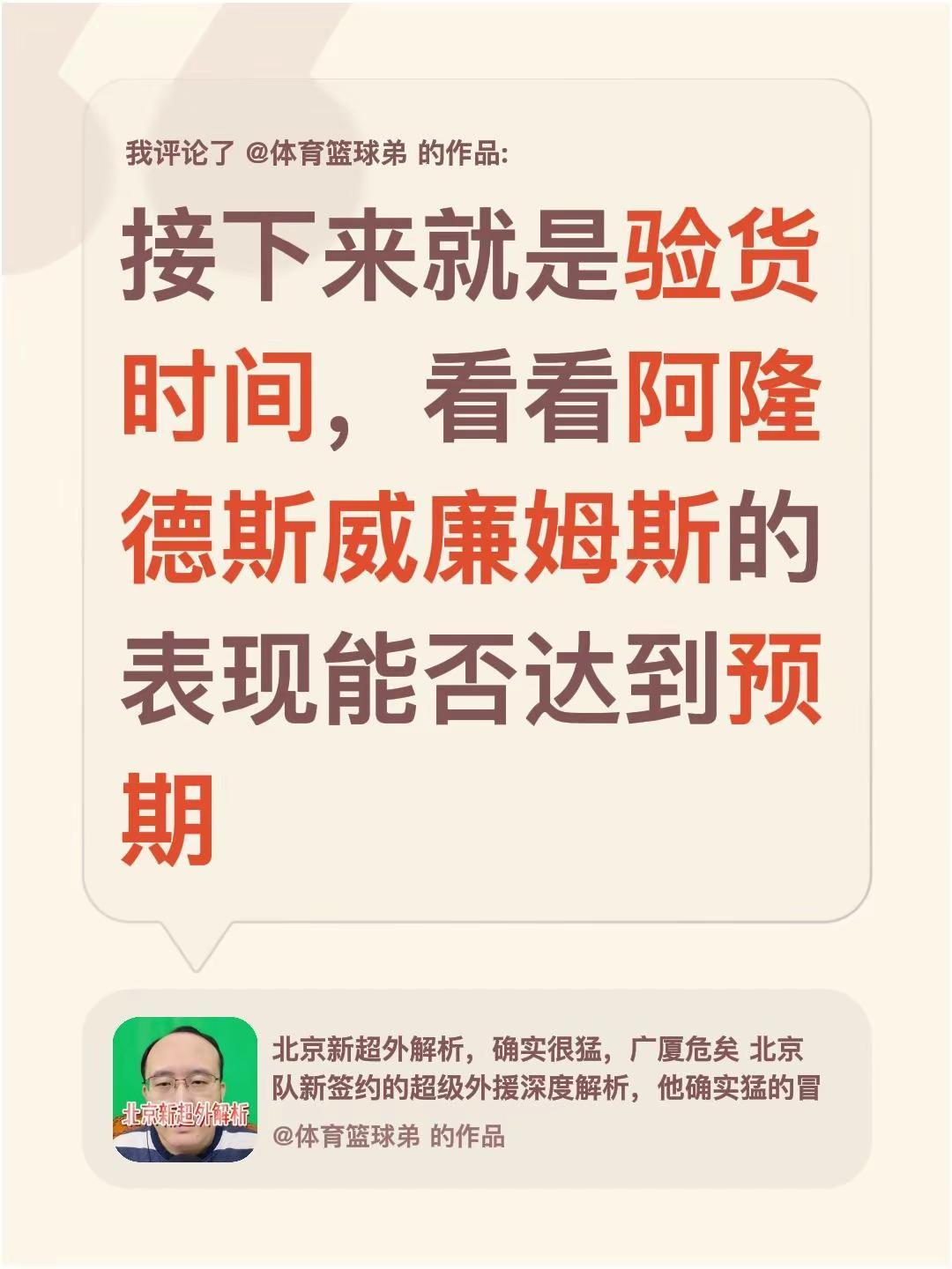 我评论了@体育篮球弟 的作品:接下来就是验货时间,看看阿隆德斯威廉姆斯的表现能否达到预期