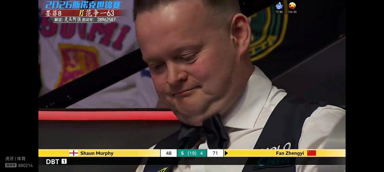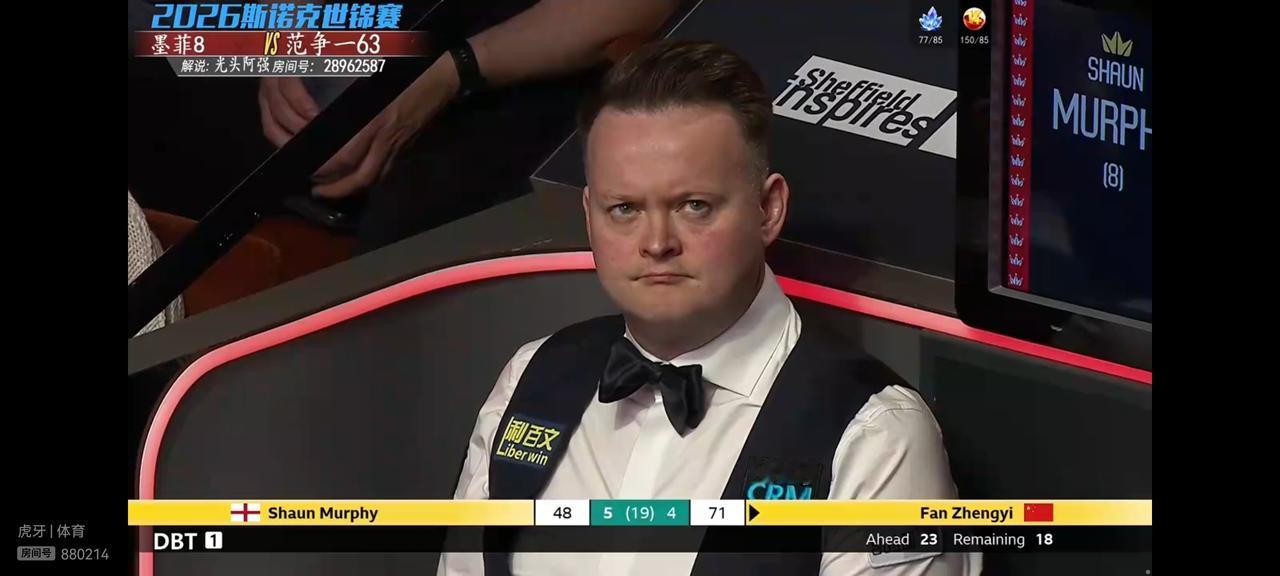 太遗憾!!!,保级选手范争一通宵大战,9:10惜败世界大满贯魔术师墨菲,无缘16强。 2026斯诺克世锦赛首轮,完赛的比赛所有的种子选手都晋级16强。 今日凌晨2点,世界排名第63的中国选手范争一,挑战世界排名第8的肖恩.墨菲。 第一阶段,墨菲5:4领先。 第二阶段,第10局,范争一便单杆62分,76:48扳平大比5:5。 之后你胜一局我胜一局,墨菲一直领先,9:8拿到赛点。 第18局,范争一挽救赛点追平大比分,进入决胜局。 第19局,再次进入乱争,范争一进攻中袋未果,留下机会,墨菲67:53取胜。 全场比赛,墨菲一杆过百,4杆50+。范争一5杆50+ 范争一,本场比赛输的十分可惜啊!!! 范争一在2022年欧洲大师赛10:9绝杀火箭奥沙利文夺冠成为中国第5位排名赛冠军,一直低迷,陷入保级境地。 (比分表墨菲在前列,范争一在后)