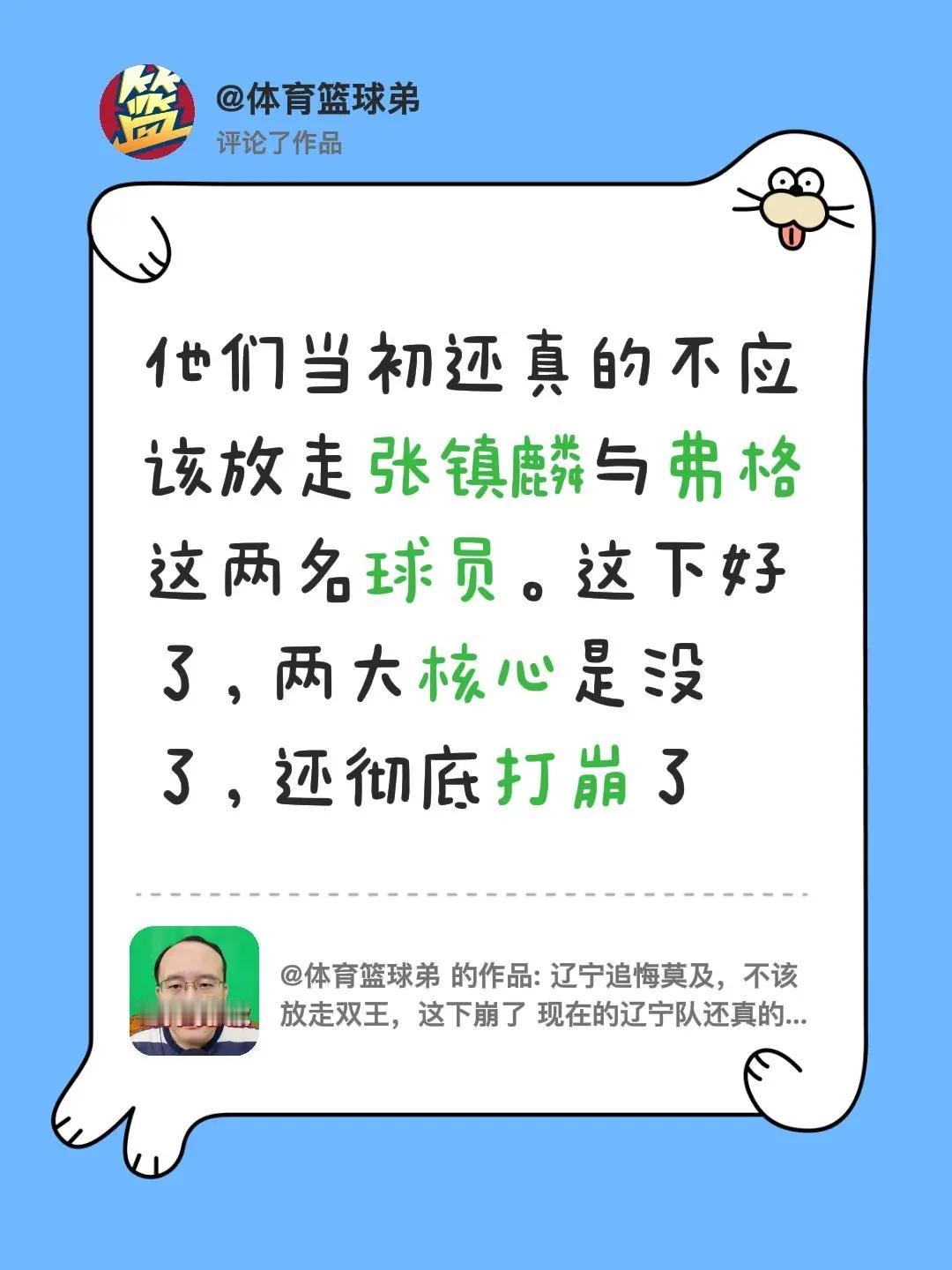 我评论了@体育篮球弟 的作品:他们当初还真的不应该放走张镇麟与弗格这两名球员。这下好了,两大核心是没了,还彻底打崩了