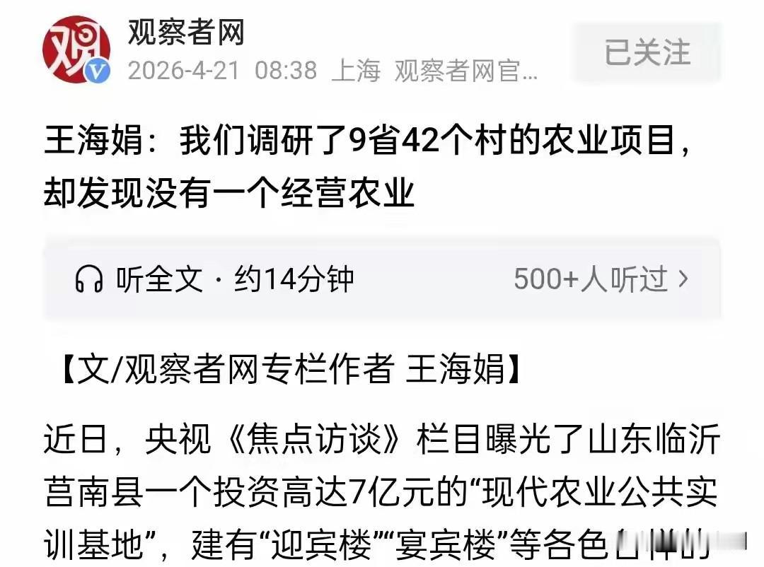 一个高校副教授关于三农问题的调研课题暴露出农业乱象。她调查了9个省的42个村,没发现一个被重点扶持的农业项目是真的在搞农业! 为何这种现象变成一个普遍问题?投资了7个亿的所谓农业实训基地,实际上变成一个会议度假村,只有迎宾楼、宴宾楼等,不见农田,没有农机,这是被央视焦点访谈曝光的山东临沂莒南县真实案例。 国家花钱,重点扶持的农业项目,为何全部非农化?值得警示和思考,乡村振兴到底在振谁的兴?过去多地鼓励资本搞农业,现在看好像是不成功的,那么多所谓的万头猪场,几乎都是失败的案例。纯农业难盈利,很多地方基层干部为了政绩,以乡村振兴为名,把美丽乡村建设、高标准农田改造全都当成旅游配套,到处拉投资,资本下乡,而失去了本源,但能成功的非常非常少。 耕地红线上建酒店、别墅是不可以的,但资本可以换个方式,只要当地政府同意就行。换个马甲,比如上述农业培训基地,或者研学基地,康养中心啥的。其实就是搞住宿餐饮,农业项目变成搞钱项目,彻底偏离本源。不少地方为此背上沉重债务。 这种似农非农模式,最直接的是损害农民利益,土地没了,提供岗位极少,农民无法分享产业收益,村级债务不断攀升,最终会拖垮农村集体经济。 乡村振兴核心是富农产业,根基是科技真农业。引入资本搞披着农业外衣的非农项目,表面光鲜亮丽,一些干部有了政绩,最终受损的可能就是农民。这样的问题值得去研究,如何让乡村振兴回归三农的初心,让农业,农村和农民都能得到发展的好处,才是最重要的[祈祷]