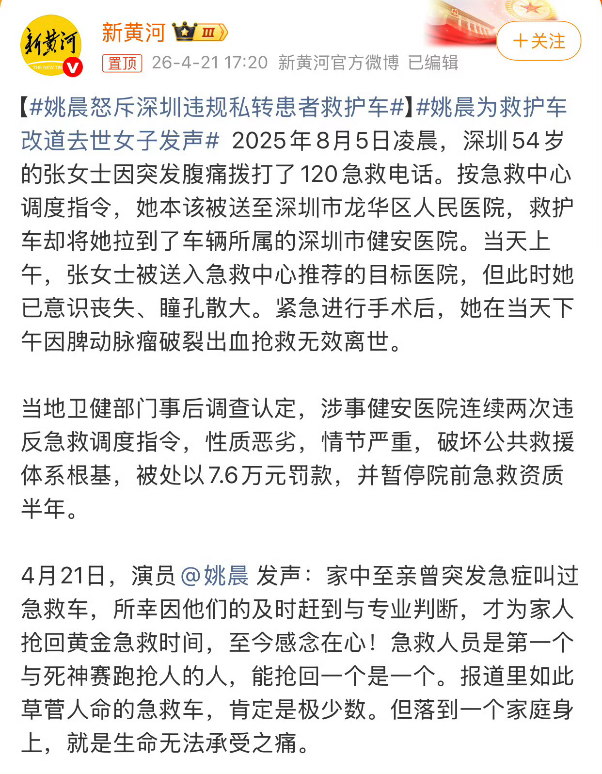 姚晨为救护车改道去世女子发声医院为了抢生意违背急救中心指令,擅自将病人拉到自家医院,耽误了最佳救治期至病人去世!才7.6万罚款就不了了之,人命关天就是这样体现出来的吗?我猜这个罚款最终还是让患者买单!悲哀!