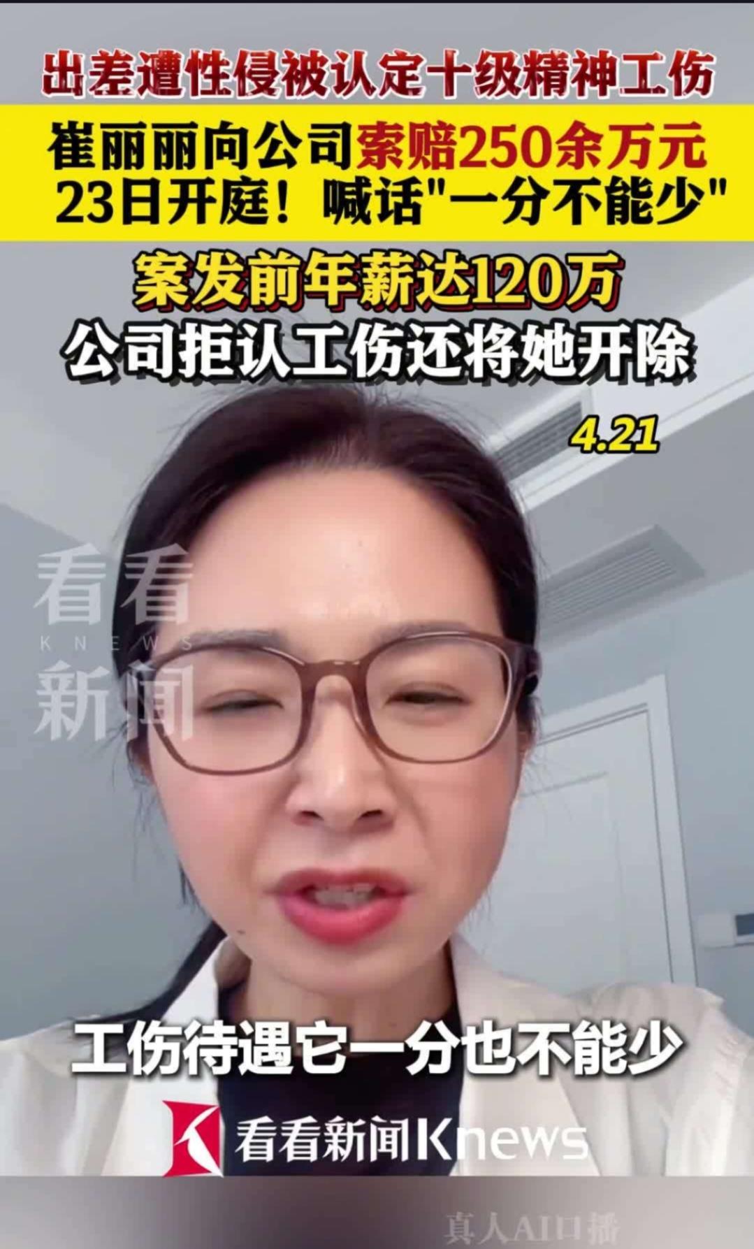 职场性侵也能算工伤?全国首例职场性侵精神工伤认定案明日开庭,索赔高达250余万,这究竟是怎么一回事? 2026年4月23日下午两点,天津市津南区人民法院将开庭审理这起备受瞩目的劳动争议案。当事人崔丽丽在2023年因工出差时,不幸遭到老板性侵,并因此确诊创伤后应激障碍。虽然人社部门已认定这属于工伤,但崔丽丽所在的公司却不仅未协助申报工伤,反而以“旷工”等理由试图解除劳动合同。此次诉讼,崔丽丽主张的权益包括长达24个月的停工留薪期工资、加班费、未休年假工资等,总计高达250余万元。案件的关键在于,刑事判决已经认定了侵害事实,而且最高人民法院的相关意见也明确指出,因工外出期间遭受的意外伤害属于工伤范畴。值得一提的是,此前被告人王某已经因强奸罪被判处有期徒刑四年。 这起案件不仅关乎崔丽丽的个人权益,更对职场性侵和工伤认定有着深远影响。你支持崔丽丽的索赔诉求吗?快来评论区发表你的看法,一起为正义发声!性侵认定工伤案 崔丽丽工伤认定 性侵获工伤 性猥亵获工伤 性侵工伤认定