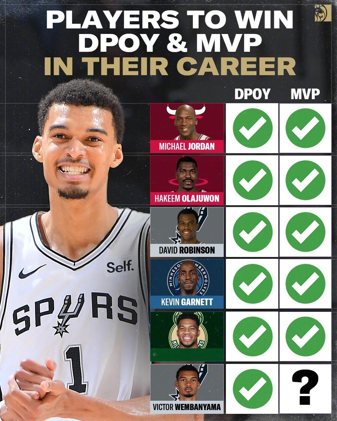 NBA历史上只有五位球员在拿到过MVP还有DPOY,如今文班的首个DPOY已经到手,他什么时候会拿到MVP,成为第六位达成此成就的球员呢?