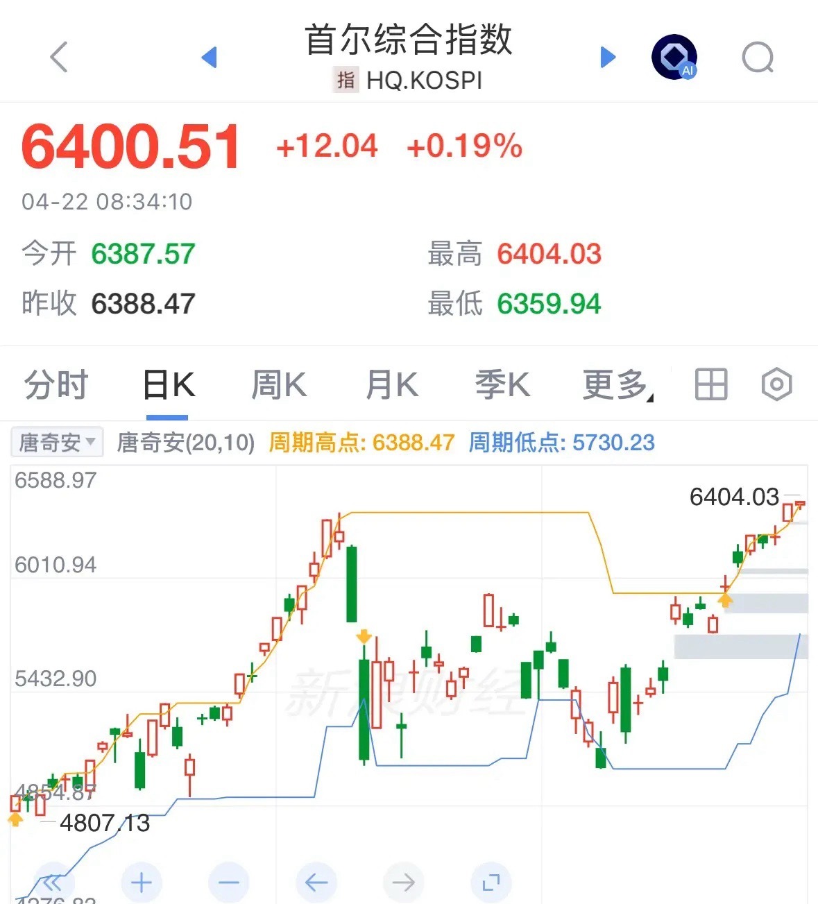 重磅利好亚洲股市上涨韩国股市突破6400点创历史新高,A股今天会跟涨吗:重磅消息,4月22日,受到美国轰炸利好延期影响,美国纳指期指大涨,亚洲股市冲高,韩国股市早盘冲高,突破6400点,再次创历史新高。A服股今天会跟涨吗?大概率也震荡上涨,毕竟A股目前才4000点,跟韩国股市还有2400点的距离!要知道2025年底A股和韩国股市都是差不多4100点,今年差距有点明显,A股还在奋起直追,保持信心,坚定看多做多A股,韩国股市能大涨,A股必须也跟涨,希望今天能迎头赶上,点赞关注验证!美伊停火延长至伊朗提方案并谈妥
