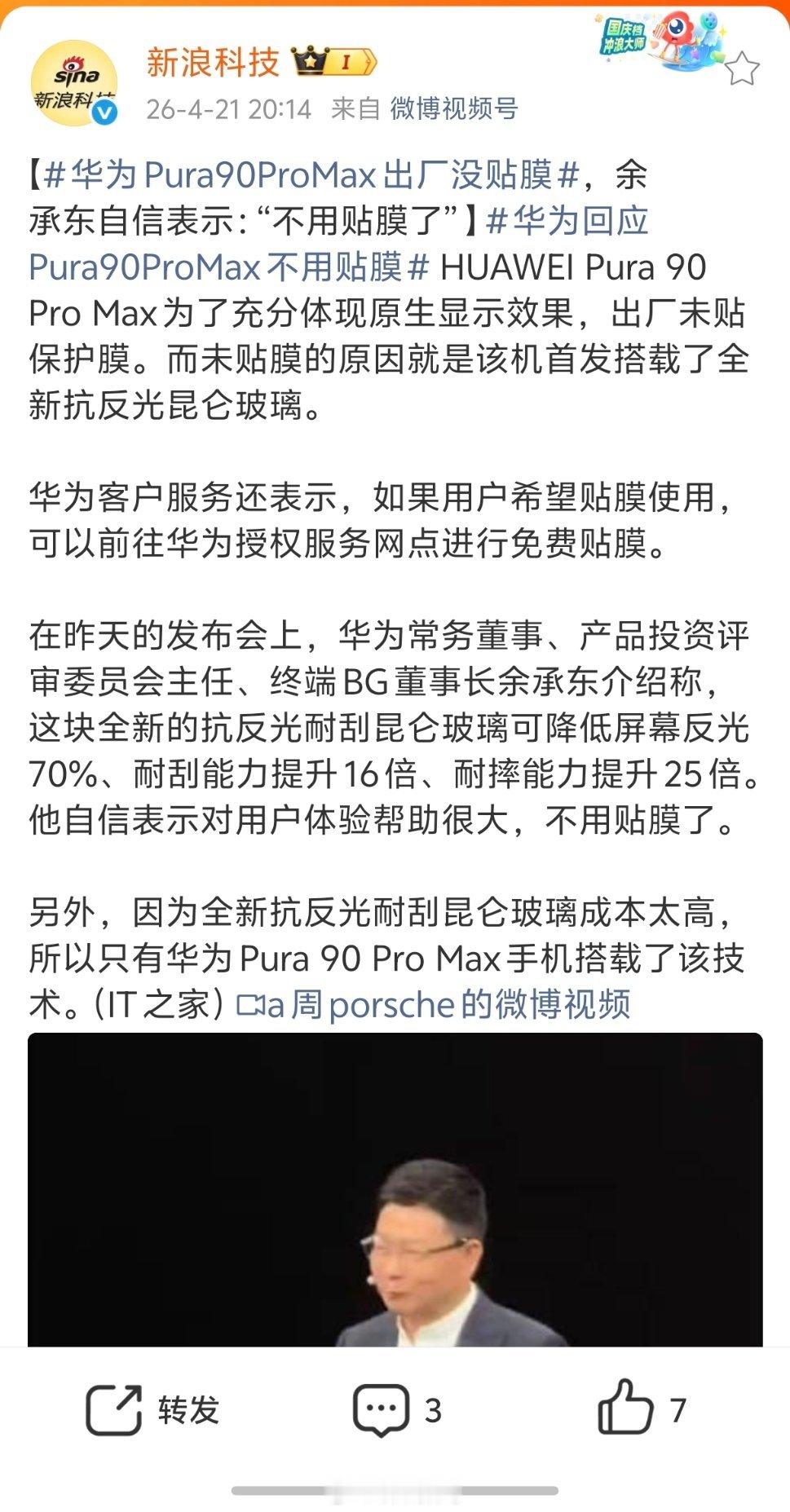 华为Pura90ProMax出厂没贴膜华为Pura90Promax出厂没贴膜,客服说如果用户希望贴膜使用,可以前往华为授权服务网点进行免费贴膜。这其实就是一种典型的本末倒置。你一开始出厂的时候就应该把膜带上,然后让用户去决定要保留,还是要撕掉,这才是一种正确的逻辑。因为即便是你可以去免费贴膜,你是不是还得要去服务网点一趟?尤其是对一些偏僻的地区,你的网点也不是到处都有。如果真要原厂不贴膜,那你就再提供一个免费寄送贴膜服务也可以,华为自己去承担这个成本,而不是让用户去承担。倒不是说华为非得要省这点成本,而是这种以用户为本的理念要贯彻。
