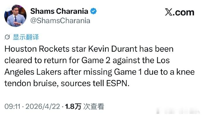首轮G2!据Shams消息,杜兰特今日复出战湖人!杜兰特G2复出