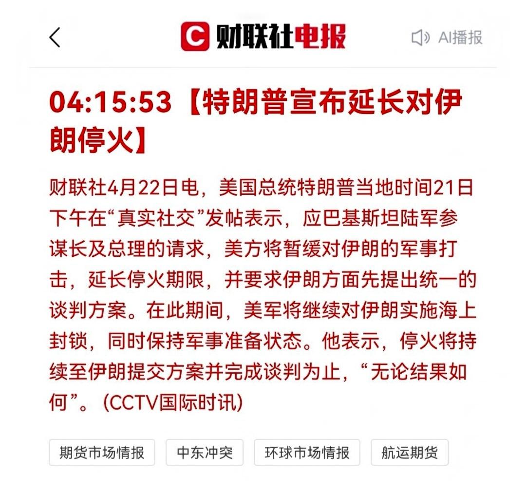 【特朗普宣布延长对伊朗停火】 财联社4月22日消息,当地时间4月21日下午,美国总统特朗普在自己的社交平台发帖,明确了最新的对伊态度:应巴基斯坦陆军参谋长和总理的请求,美国会暂缓对伊朗的军事打击,延长停火期限。但他同时也划了明确前提,要伊朗先拿出一套统一的谈判方案。 很多人可能觉得停火就是彻底不打了,其实并非如此。特朗普说得很明白,在这段停火期里,美军不会解除对伊朗的海上封锁,所有军事力量也会一直保持随时可作战的准备状态。更关键的是,这个停火没有固定截止时间,会一直持续到伊朗提交方案、两边完成谈判为止,无论最终谈判结果如何,这个规则都不变。 美国和伊朗的矛盾,根本不是一天两天攒出来的,到现在已经持续了几十年。大家最熟悉的就是之前的伊核协议风波,特朗普第一次担任美国总统时,直接让美国退出了伊核协议,重新对伊朗启动大规模制裁,从那之后,两边关系直接跌到谷底,这些年里,大大小小的摩擦从来没断过,这次闹到要全面动武的地步,也是这么多年恩怨一点点积累的结果。 这次特朗普宣布延长停火,看起来是给了和平一个缓冲机会,其实背后全是国家之间的利益算计。首先,美国要是真的对伊朗发动全面军事打击,后果根本没法控制。中东一旦开战,国际油价肯定会大幅上涨,而美国国内现在的物价压力本来就不小,油价一涨,普通老百姓的生活成本会直接升高,这对特朗普接下来的执政来说,绝对不是好事。 另外,他借着巴基斯坦的请求宣布停火,其实也是给自己找了个台阶。既不用马上做出开战的决定,又把所有压力都推给了伊朗。现在要不要谈、拿出什么样的方案谈,都要伊朗先做决定。而且他手里的军事威慑一点都没撤,只要谈判结果不满意,随时都能重启军事打击,主动权完全握在自己手里。 现在最关键的,就是伊朗接下来会怎么应对。一边是持续的封锁和军事压力,一边是要先拿出方案的前提,伊朗会选择坐下来谈,还是继续保持强硬?就算两边真的坐下来谈,积攒了几十年的矛盾,也不可能靠一次谈判就彻底解决,后续会不会再出变故,谁也说不准。 各位读者你们怎么看?欢迎在评论区讨论。 特朗普延长停火计划