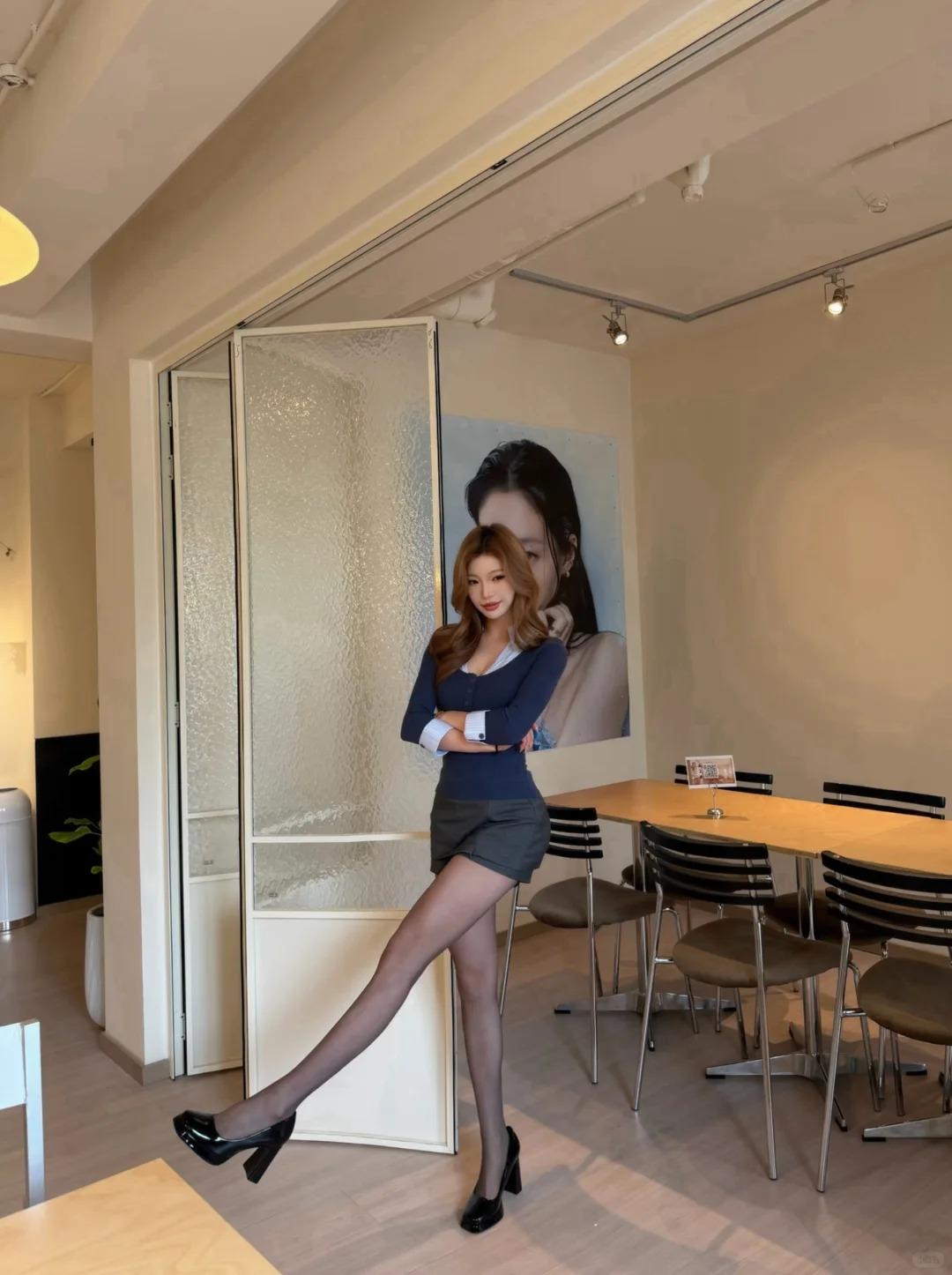 OOTD 穿搭|咖啡店姐感拍照,零废片公式来了! 姐妹们!在咖啡店拍出这种又纯又欲的姐感照片,今天这套真的是懒人直接抄作业的程度! 假两件的藏青针织衫+灰色西装短裙,配上黑丝和厚底高跟鞋,一整个韩系学姐的感觉! 拍照姿势也给你们整理好了,完全不用怕尴尬: ✅ 坐在吧台椅上,双腿交叉靠在椅背上,一只手撑着吧台,眼神看向镜头,清冷感直接拿捏 ✅ 站在窗边,双手抱胸,一只脚轻轻点地,歪头笑一下,氛围感直接拉满 ✅ 侧坐在洗手台,手撑在台面上,腿自然垂下来,光影打在身上,巨显腿长