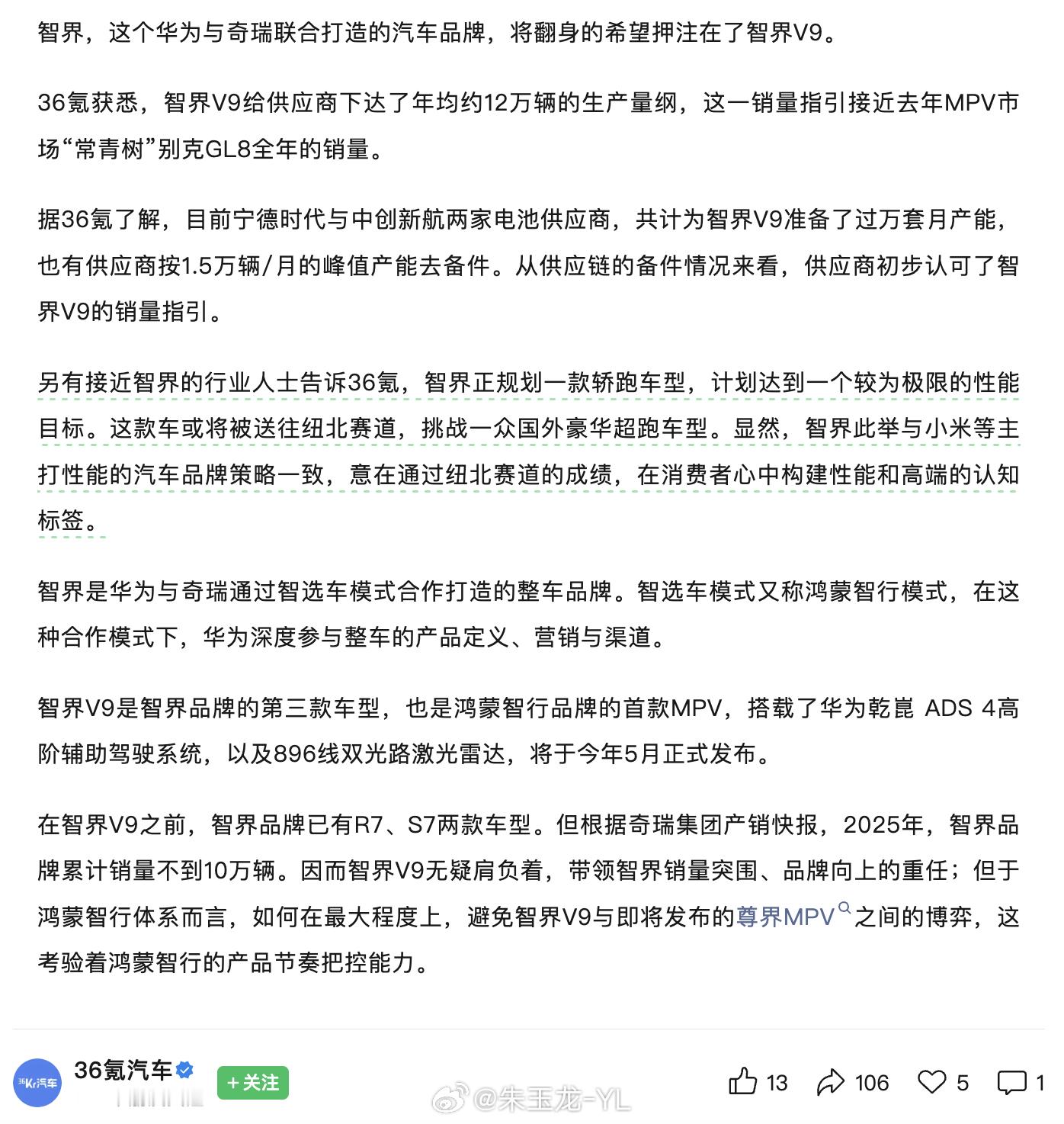 圈重点智界 V9 为鸿蒙智行首款 MPV,搭载华为乾崑 ADS 4+896 线双光路激光雷达。向供应商下达年均 12 万辆销量指引,月均目标 1 万辆,峰值 1.5 万辆 / 月。12 万辆年销对标 2025 年 MPV 标杆别克 GL8 全年销量(约 12.24 万辆)