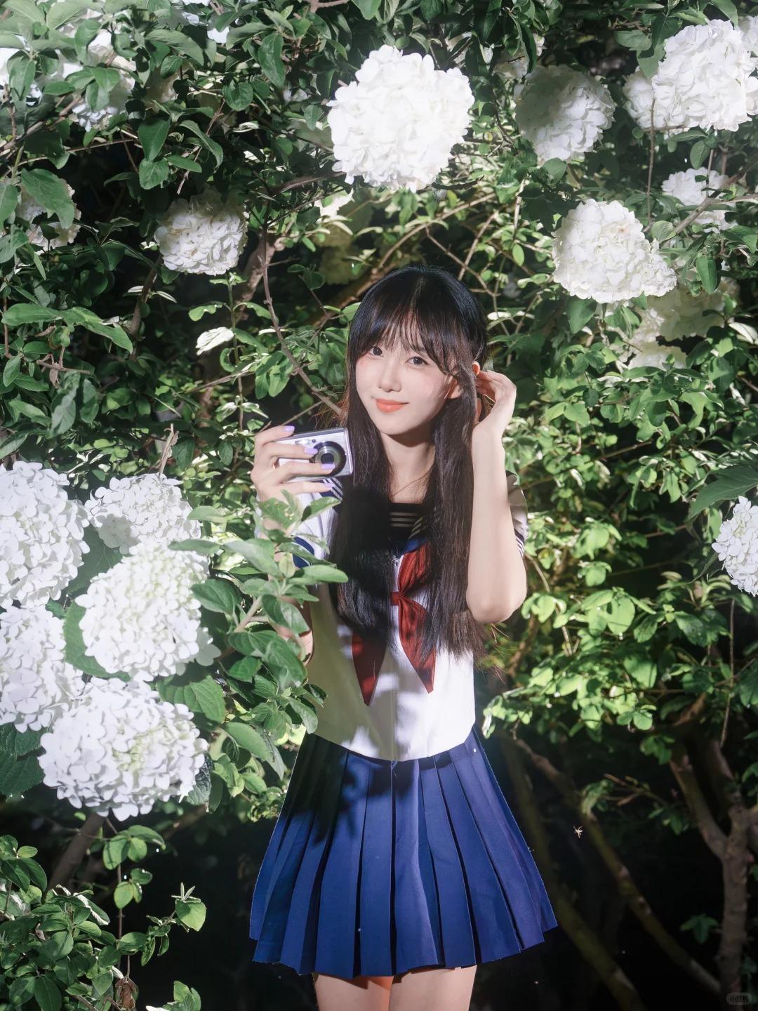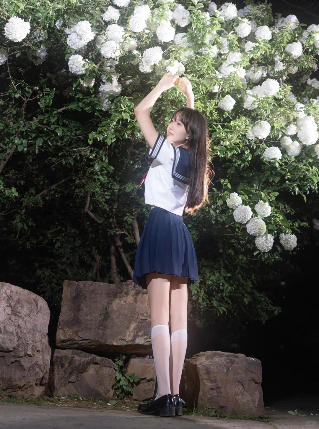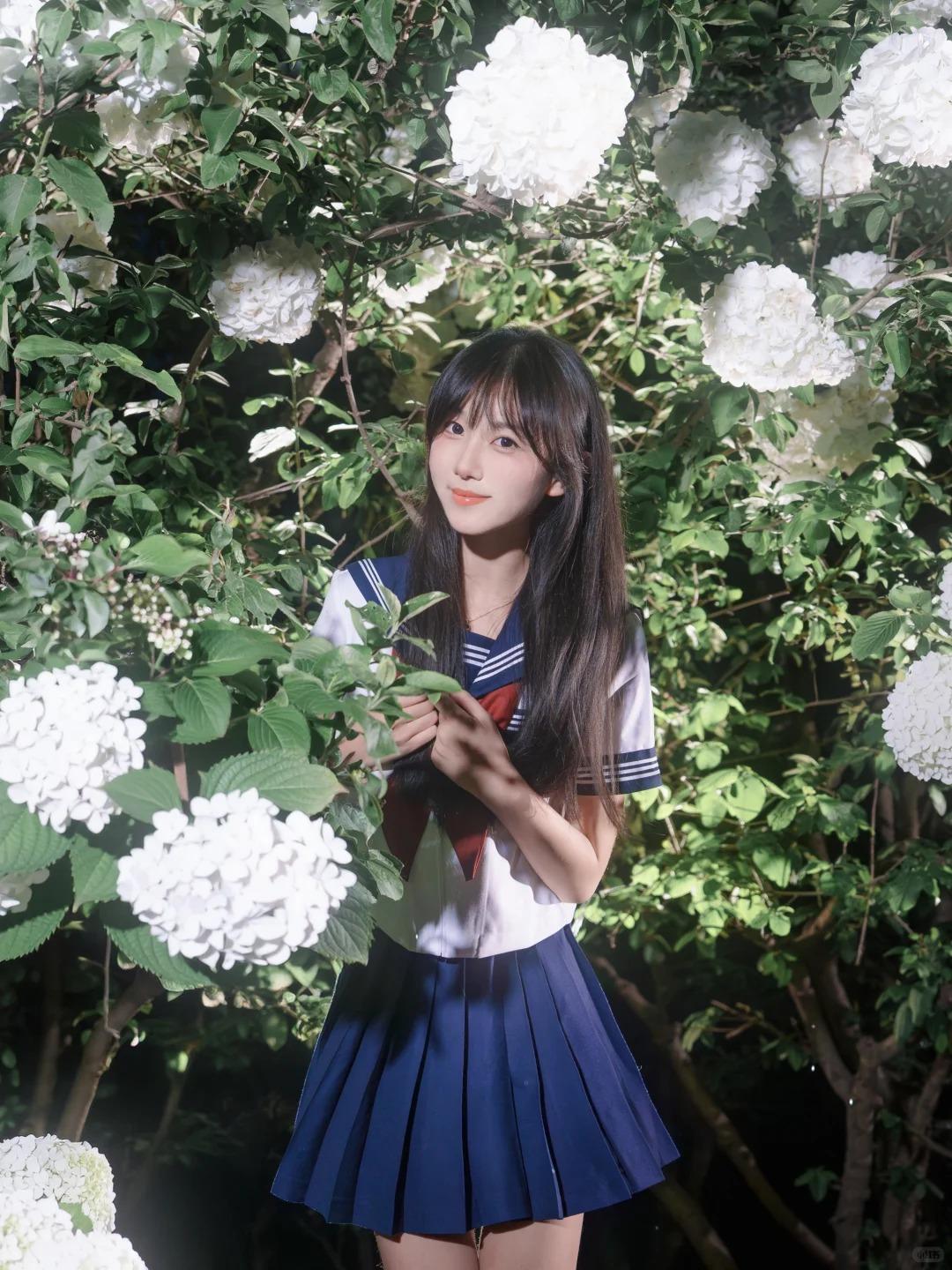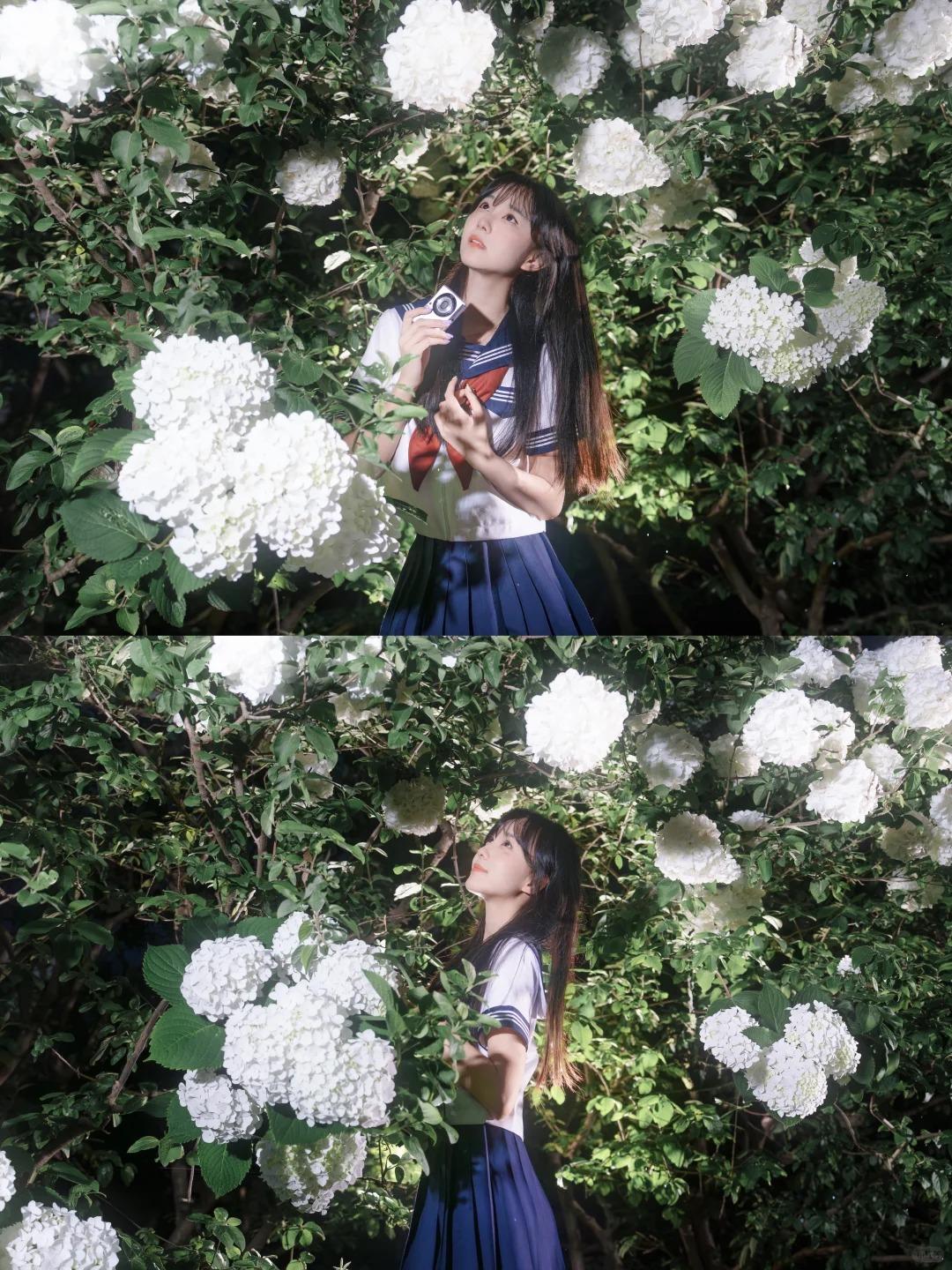 放学别走,今晚的绣球花和晚风都在等我✨ 换上水手服,趁着夜色溜到开满白绣球的小花园。 补光灯一打,花团像裹着月光,风里飘着软乎乎的甜香。 举着ccd随便按两张,发丝和花瓣都在发光,像从日剧里走出来一样。