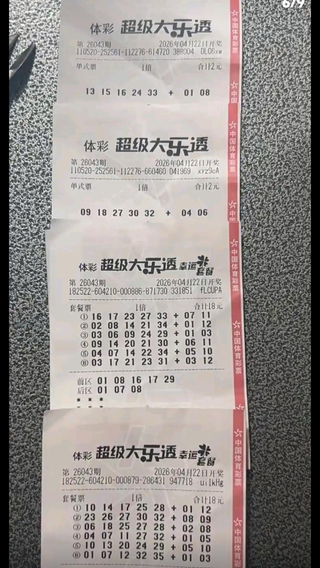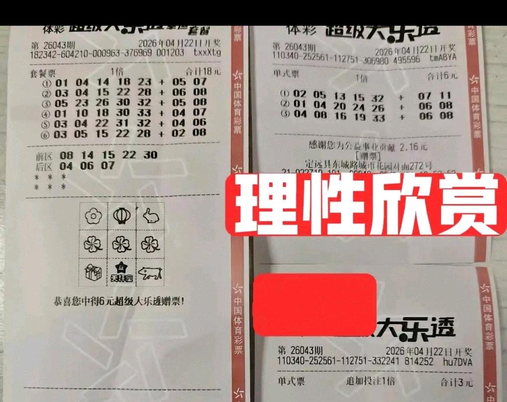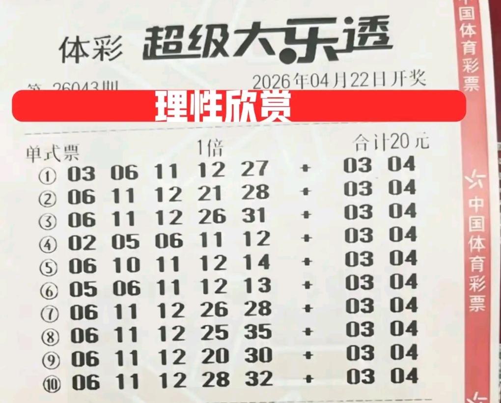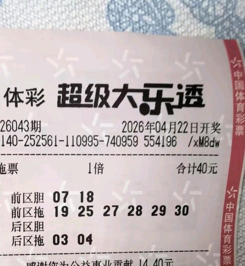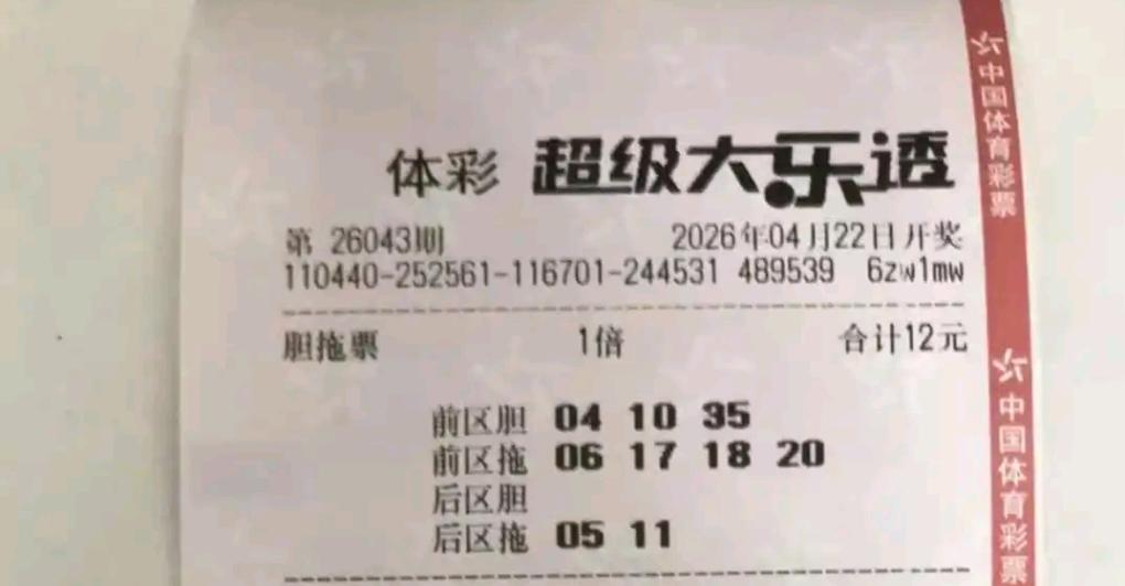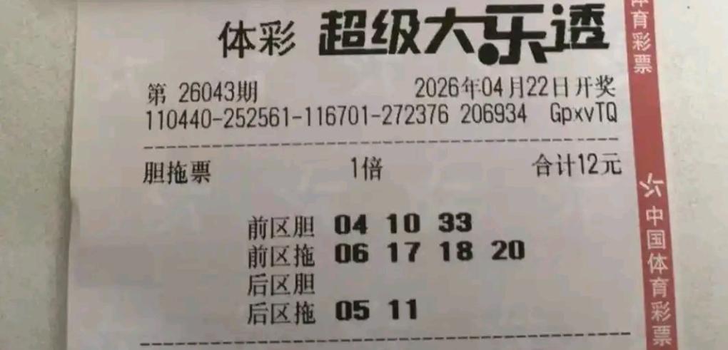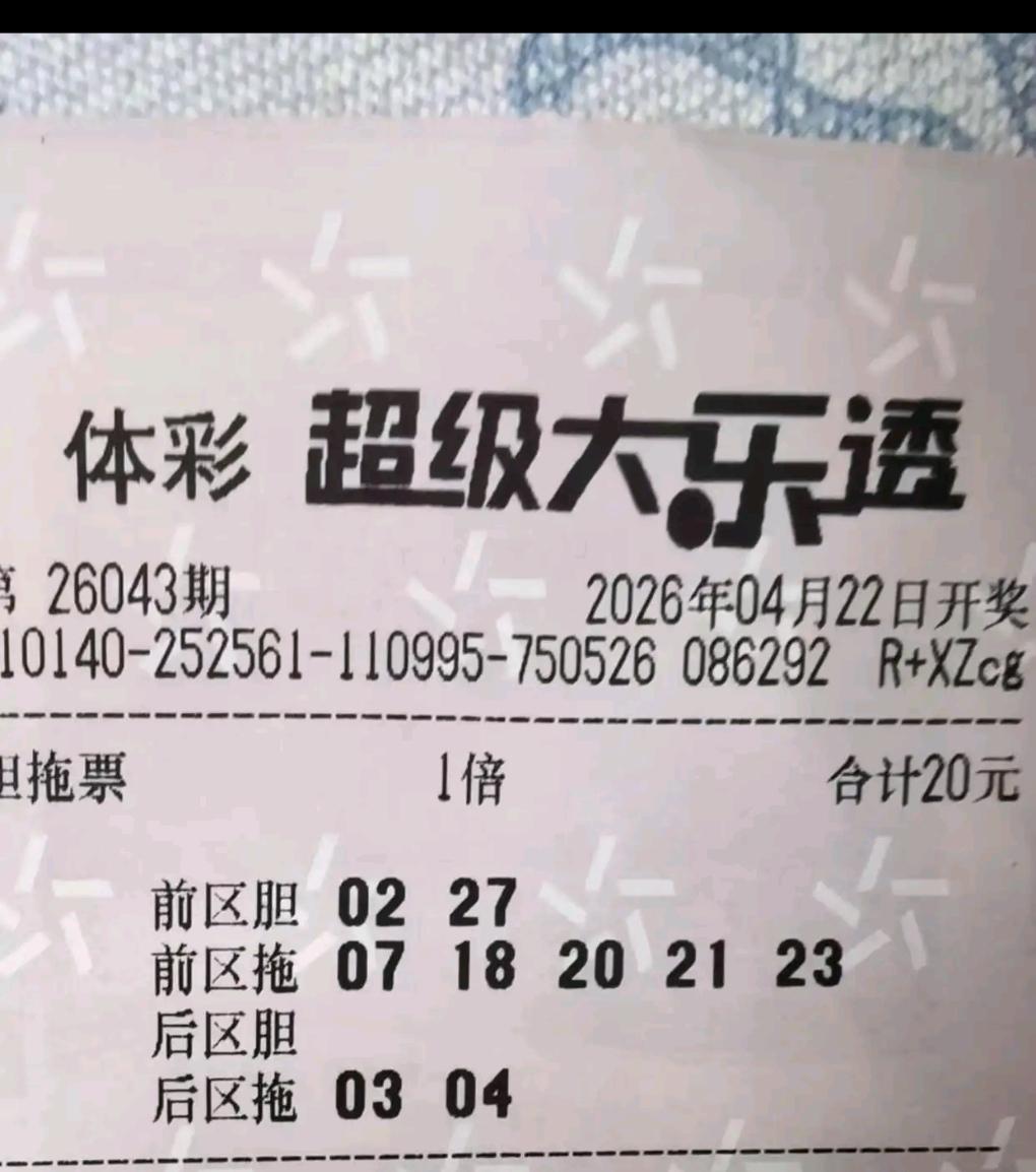 大乐透26043期晒票:胆拖小票扎堆,10倍单式亮出连号 大乐透26043期开奖前,多张实票提前亮相。多张胆拖小票组团出击,双胆、三胆组合各有思路,号码多以重复号、同尾号为主。 另有多张单式票登场,其中两张10倍单式尤为亮眼,后区选定03/04、04/10,前区搭配11/12、26/27双连号,组合十分有特点。 各类票型仅供欣赏,理性购彩,切勿盲目跟风。