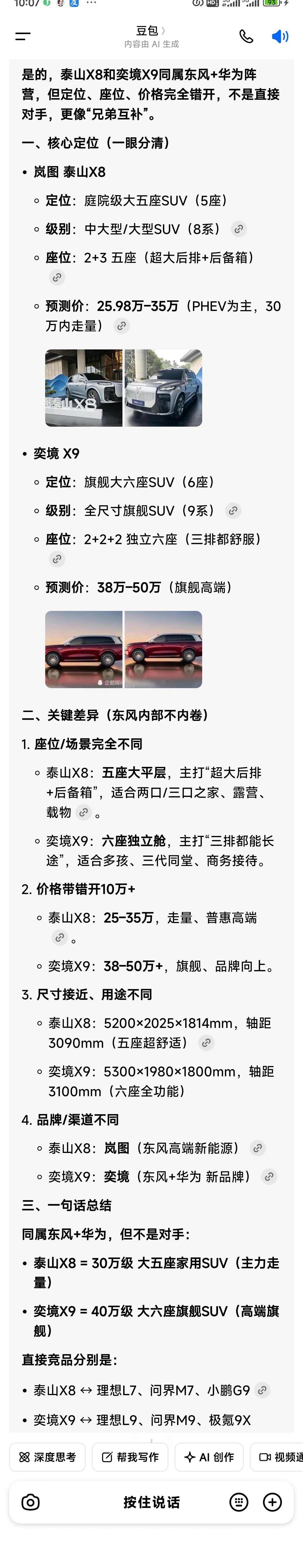东风系的岚图5座泰山X8和奕境X9是竞争对手吗? 看看豆包怎么回答和预测! - 泰山X8 ↔ 理想L7、问界M7、小鹏G9 - 奕境X9 ↔ 理想L9、问界M9、极氪9X [太阳] 6座版岚图泰山和奕境X9,是 同档次、直接竞争 的东风旗舰六座SUV。 都是 5.2~5.3 米级、大概都在38~50 万?大六座、华为智驾+鸿蒙座舱。
