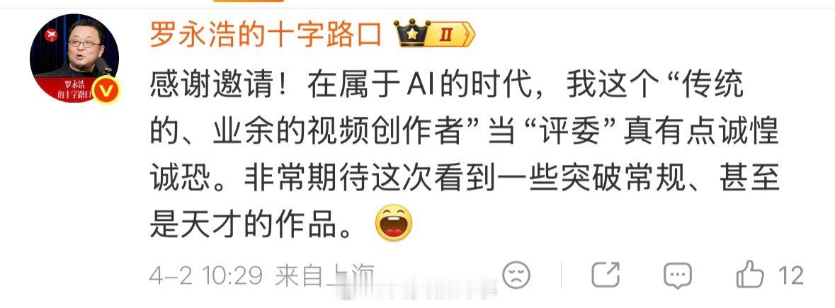 主办方邀请罗永浩等担任活动特邀评委,对此,罗永浩曾留言回应:感谢邀请!在属于AI的时代,我这个“传统的、业余的视频创作者”当“评委”真有点诚惶诚恐。非常期待这次看到一些突破常规、甚至是天才的作品。