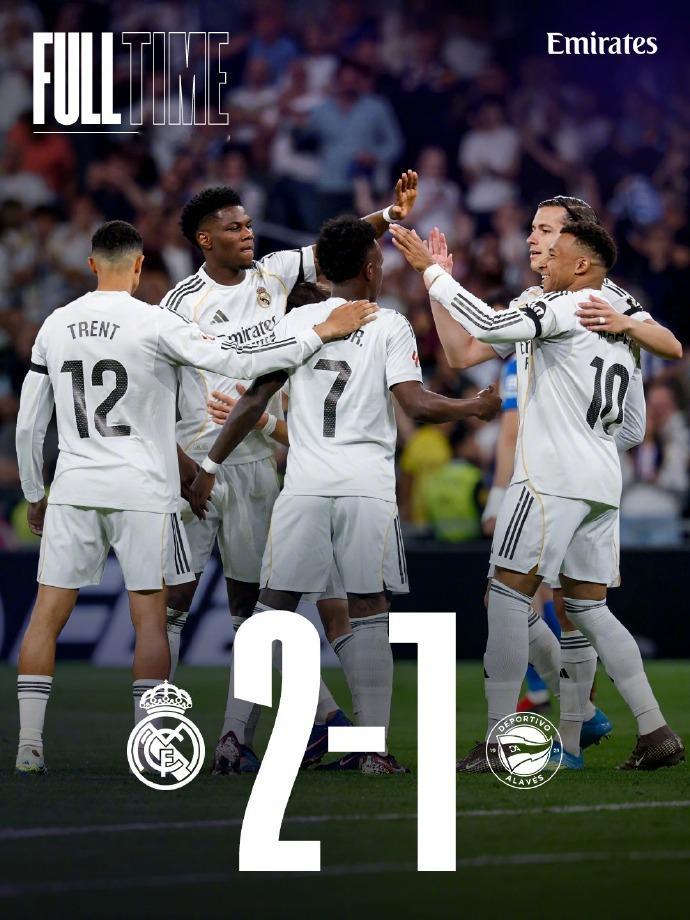 上半场,姆巴佩外围远射发生折射入网,米利唐伤退。下半场维尼修斯世界波,马丁内斯补时破门。最终皇马2-1阿拉维斯。