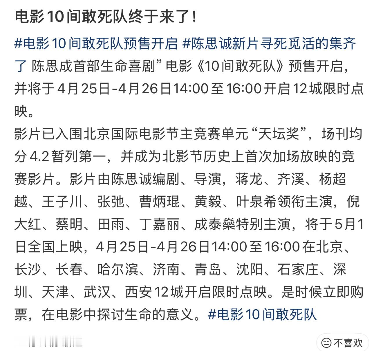 电影10间敢死队预售开启陈思诚新片寻死觅活的集齐了大胆预判!《10间敢死队》就是五一档最值得期待的喜剧!陈思诚这部“生命喜剧”,真的太让人期待了!
