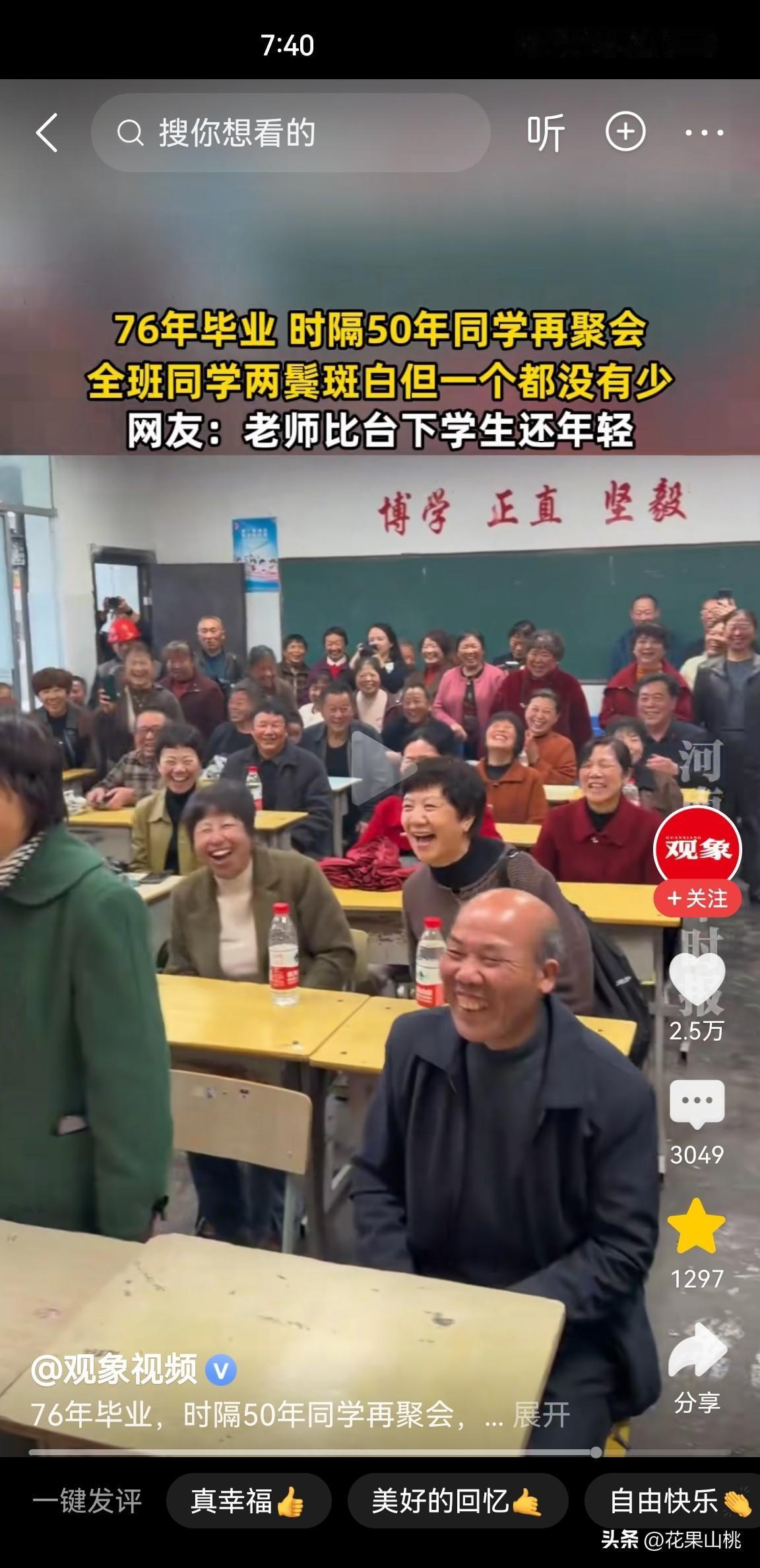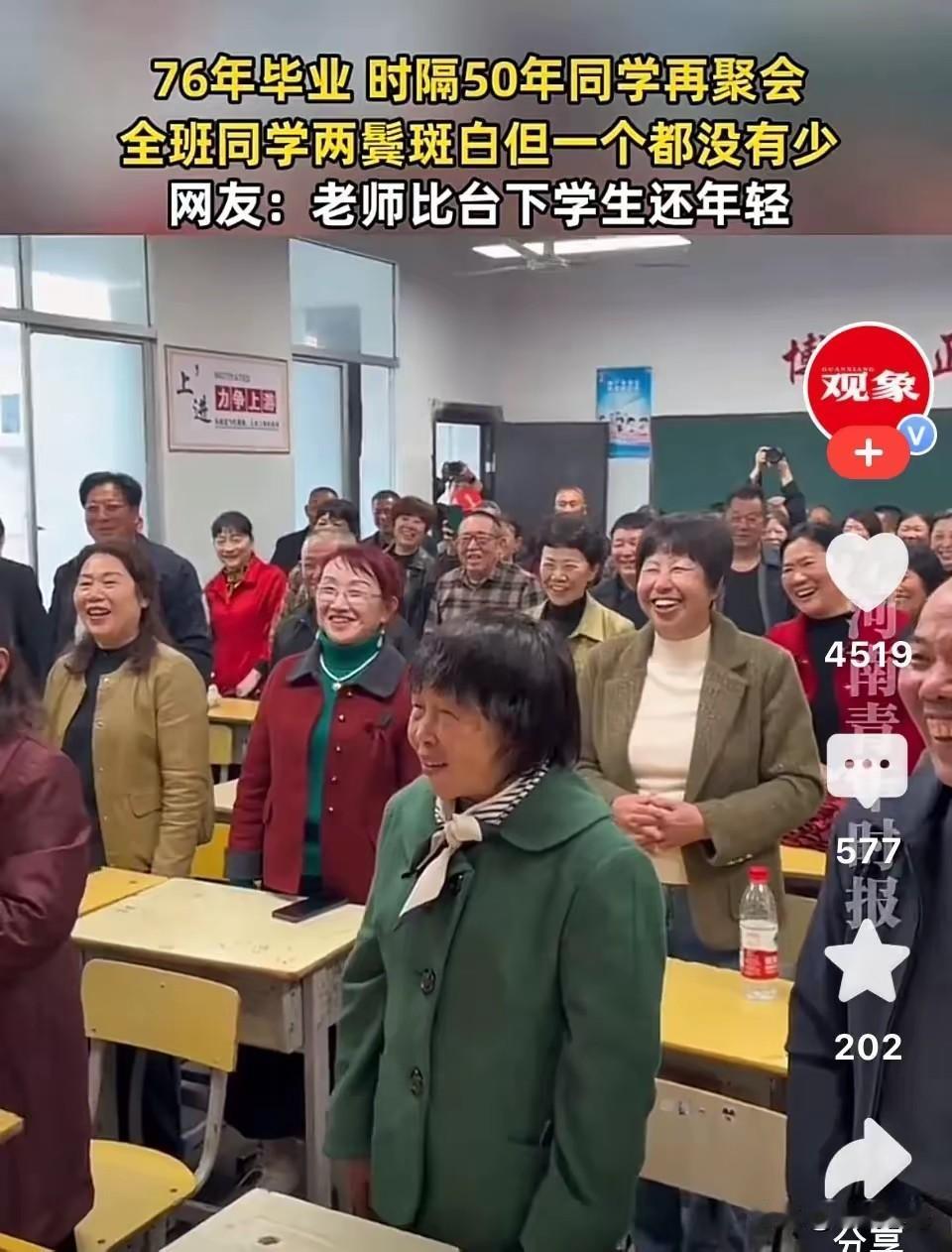50年再聚,一个都没少! 一帮76年毕业的学生,时隔50年同学再聚会,都已两鬓斑白但一个都没少,老师比台下学生看起来还年轻。 这场跨越半个世纪的聚会,就在4月21日,湖南长沙76届宁乡十中,毕业50年重回母校教室,师生相聚。 都已是两鬓斑白的他们齐刷刷的坐进教室里,看着当年的班主任老师又一次走进教室、站在讲台上,随着当年班长一声清脆的“起立”声,同学们瞬间湿了眼眶,老师也已是眼含热泪。 那声不再年轻的“老师好”后,班里爆发出一阵欢乐的、激动的、充满热情的笑声。 那笑声依旧如当年般响亮;只是老师的脚步变缓了,环视台下学生的目光更加慈爱了,那一刻,恍惚间又回到了读书时;那一刻,青春仿佛从未散场。 50年就是半个世纪,同学们依然能齐聚一堂,本身就好难,大家都已是年过半百、头发花白了,还能从四面八方、一个都不少回到曾经读书的课堂相聚,令人动容。 看过视频的网友都纷纷感叹,毕业50年还能一个不少的聚齐,真的不容易。 有网友推测,76年初中毕业,如果是高中毕业的话不敢说都能聚齐,初中毕业,年龄大约都在66岁左右,老师至少也有70多岁了。 不少网友感叹,说80后的,同学中已经有好几个人永远离开了,永远都聚不齐了。 还有不少网友在评论区晒出自己与同学们聚会的照片,即使都健在,也很难聚齐。 大家都表示羡慕,毕业50年后还能与老师一个不少的齐聚一堂,也算是奇迹了。 这份珍贵的同学情、师生情,值得永远珍藏。 朋友们,你们同学还聚吗?还能聚齐吗?欢迎评论区留言讨论。