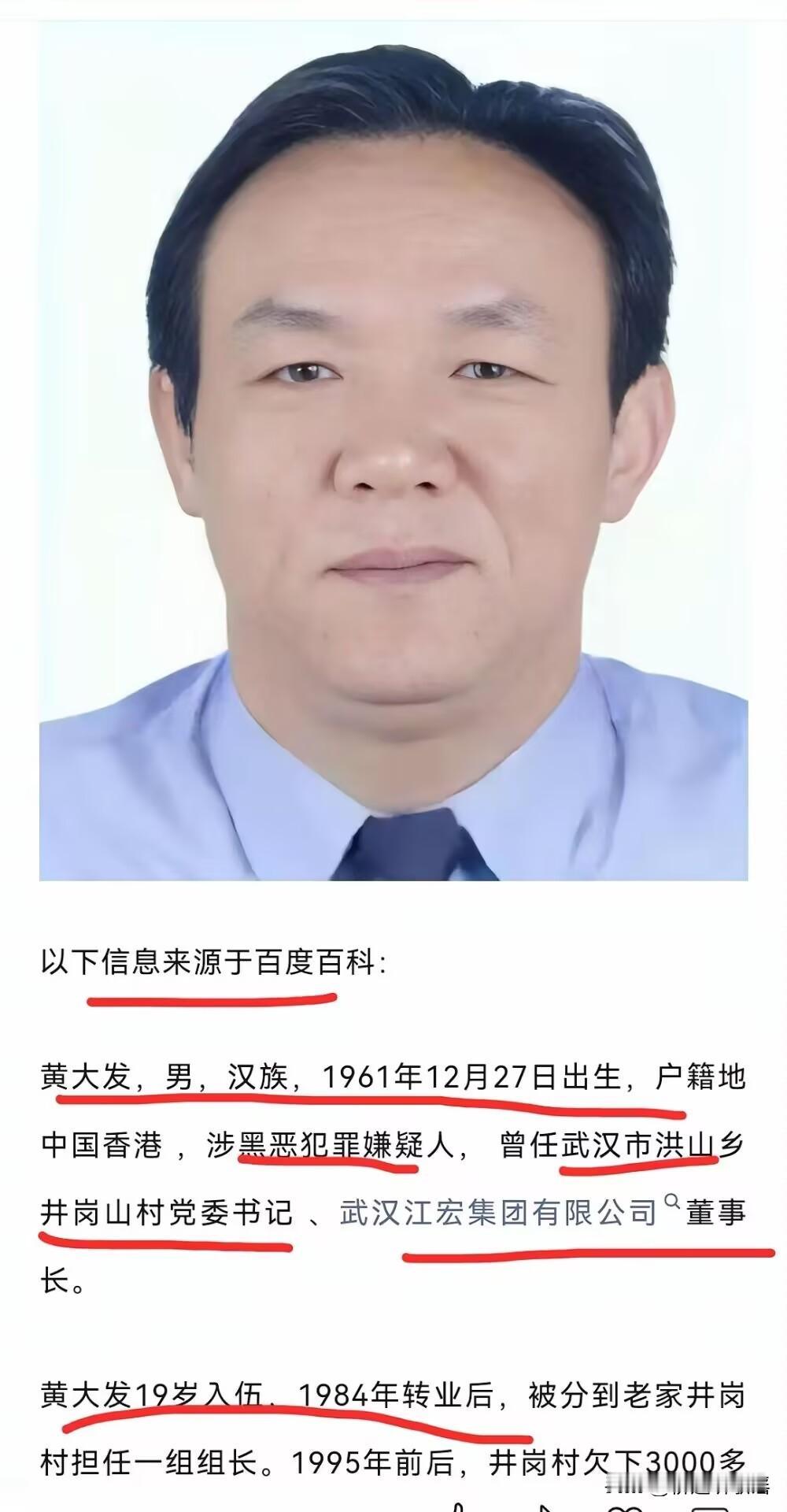 干得好!湖北武汉特大黑恶头目黄大发,被判极刑! 这个披着“村支书”“企业家”外衣的恶人,在武汉当地横行霸道近30年! 4月20号,湖北省黄冈市中级部门一锤定音。几项主要罪名往桌上一摆,判的是极刑,个人名下财产全部充公。这颗在武汉盘踞了快三十年的钉子,终于被连根拔起来了。 跟他一块儿宣判的还有十来个同伙,刑期从十几年到两年多不等。所有通过歪门邪道弄来的家底,一律追缴上缴国库。这个结果,用当地话讲就两个字:解恨。大伙儿等这天等得实在太久了。 说起黄大发这仨字,武汉本地上了点年纪的人没有不摇头的。明面上他是洪山区某个村的领头人,是集团公司的董事长,是各种表彰会上的红人。但在街坊邻居嘴里,提起他都得下意识压低声。 这人最会装样子。当年刚接手村里烂摊子的时候,账面欠着一大笔外债,他拍着胸脯说三年填不平就自己走人。结果转头就搞起了房地产开发,借着周边地段改造的东风,开始疯狂圈地盖楼。 从零几年到一几年那段时间,黄大发在南湖那块儿几乎把控了周边好几个村的改建工程。他过手的楼盘项目数不清,大大小小上百个。最风光的时候,光他名下几家物业公司一年进账就顶得上天文数字。 钱是怎么来的?说白了就四个字:欺行霸市。当地干土方活儿的都知道一个规矩——只要黄大发接了工程,旁人连问价都不敢问,问了就是找不痛快。谁想租个门面做小买卖,都得先看他脸色。 2016年洪山区板桥村那场乱子,至今想起来还让人后背发凉。两百多个凶神恶煞的人拿着家伙冲进去,见屋子就扒、见车子就砸。几十辆好车被砸得面目全非,还闹出了人命和重伤。那场面跟拍电影似的,可那是真刀真枪的祸害。 他那个弟弟也不是省油的灯。2014年兄弟俩被曝利用改造机会强占土地、霸占民房,硬逼着一家药厂关门,几十户员工大冬天被赶到大街上。这些年被他们弄得倾家荡产的人,数都数不过来。 有人私底下议论,说黄大发就是现实版的某个电视剧里的反派。确实,从村官到地产大鳄,从还债模范到地方一霸,他这一路走得跟编好的剧本似的。但戏里的坏是假的,他干的每一件缺德事都是真的,沾着别人的血汗。 2023年5月是个拐点。湖北省黄冈市那边的执法单位贴出一纸告示,面向大伙儿征集黄大发这一伙人的线索。告示贴得满大街都是,小区门口、宣传栏、地铁站,连宾馆外墙都没落下。 十几个人的照片排成几排,黄大发的头像单独放大搁在最显眼的地方。这摆明了是动真格的了,而且是跨区域办案。那些年受过气的人终于敢开口了,线索哗啦啦地往办案单位里头递。 到了2025年初,湖北省里专门开了个通气会,宣布黄大发这一伙被彻底打散,一百多号人被抓。这是近几年以来,湖北端掉的最有分量的一伙子。 从贴告示到最后判决,前后花了快三年。有人觉得慢了,但细想这事儿急不得。那么多罪名,哪一条不得查个底掉?能把一颗埋了三十年的雷给挖出来排掉,这本身就是对规矩最大的交代。 回头看看黄大发的发迹路,离不开一个词:地段改造。武汉从零几年开始推动城中村翻新,本意是让大伙儿住得好点,结果被黄大发这帮人钻了空子。他们套着开发商的外壳,干的是明抢的买卖,把好端端的惠民工程搞成了自家的钱袋子。 当年洪山区有个负责人后来也因为不干净栽了跟头,跟这些暴力拆迁的破事扯不清关系。黄大发能横着走那么多年,光靠手下那群莽夫肯定不够,背后没人撑腰他绝走不了这么远。 前几年开始的那场全国性的大整顿,虽然告一段落,但收拾这种人的活儿永远在路上。黄大发的结局就是最好的证明。专项行动可以收官,但对付这些祸害的劲头,一天都不能松。 从别的地方那些倒台的典型,到武汉这个黄大发,每一个被严惩的头目背后,都是大伙儿对公道的期盼。老百姓最恨什么、最烦什么,规矩就该照着什么去使劲。 黄大发被判这件事,不光是一个人的结局,更是敲给那些还在暗处藏着的人的警钟。别以为换身行头就能接着混,别以为年头久了就没人翻旧账。这本账记得清清楚楚,该还的债,早晚都得还。 各位读者你们怎么看?欢迎在评论区讨论。