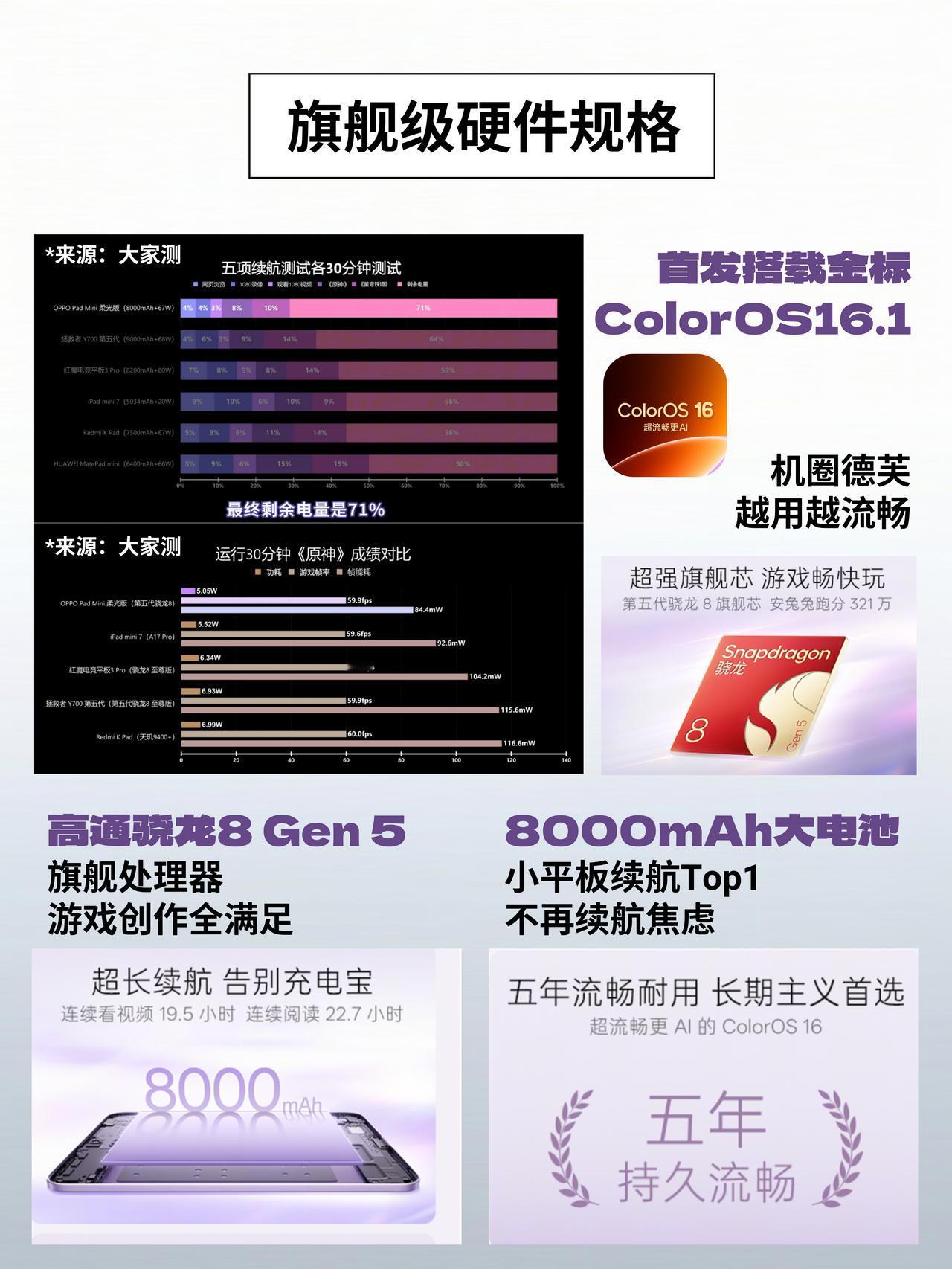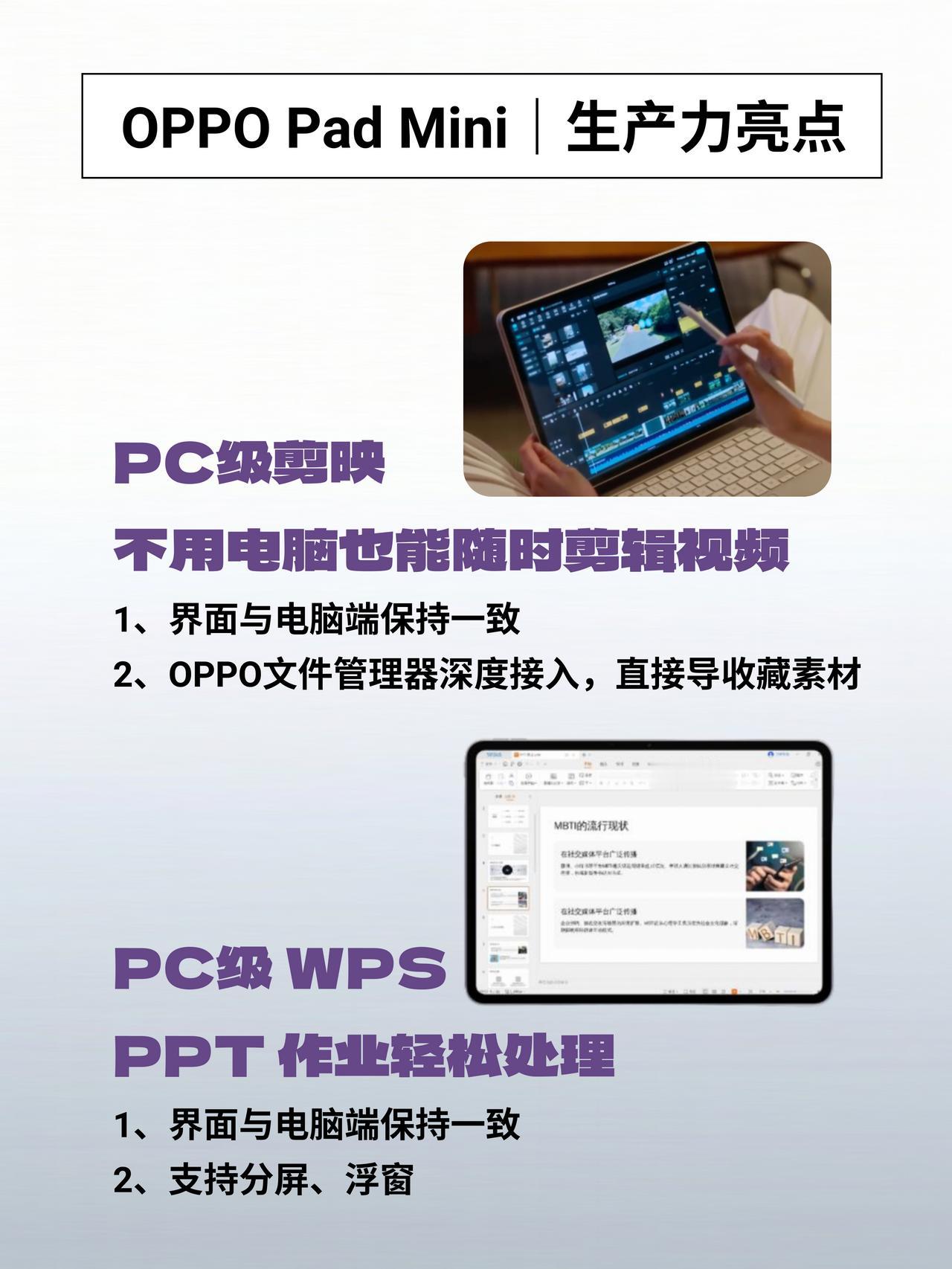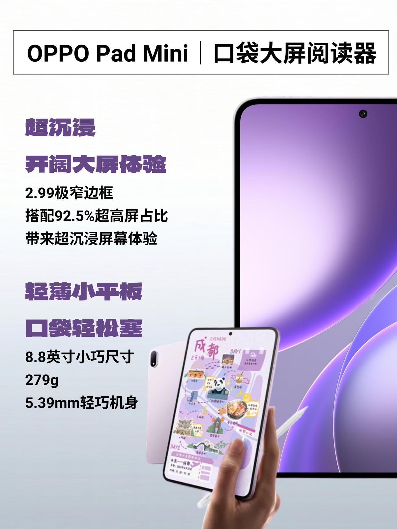 3199??今年zui能打的小平板之一来了! OPPO Pad Mini价格公布了!g补后3199,首xiao还送笔和耳机这些 有一说一,以这个配置,这个价格真的算挺香的了 毕竟小平板这个市场,一直都有一个通病,系统好的芯片一般,芯片猛的,系统或者屏幕又差点意思 说白了就是总有一块要你忍。 不过OPPO Pad mini这次感觉做得挺均衡的了 性能:第五代骁龙8旗舰处理器 王者荣耀这些游戏肯定是没压力了,就算是暖暖或者崩铁这一类的游戏,带着出门随时开一局都没太大问题。 屏幕:个人觉得这次给的屏幕素质表现还不错,用上了OLED,而且还是窄边框,这个分量懂的都懂,尤其是目前一大批小平板还是LCD屏的情况下。其次像是护眼认证那些该有的都有了,个别人可能会比较在意中间的挖孔,个人觉得无所谓,因为现在手机基本上也是这样,已经习惯了~ 轻便:机身279g、厚度5.39mm,比iPad mini还轻,塞进小包甚至裤兜都没问题,通勤路上单手握着用完全没压力 系统:ColorOS 16支持与iPhone通话共享、短信互通,安卓平板能接iPhone来电,还有PC级的剪映和WPS,用来轻办公也完全不成问题,而且官方承诺5年持久流畅! 你们说,这算不算是今年zui能打的小平板?