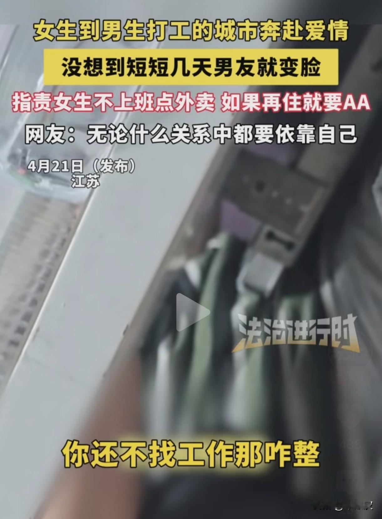 女生为爱奔赴男友城市,刚到就被催找工作要AA:有些爱情,撑不过现实的一周 看完江苏这个姑娘的遭遇,我心里又凉又堵,隔着屏幕都替她不值。 为了所谓的爱情,她辞掉了原来的工作,打包行李,跨越千里,一头扎进了男友打工的城市。 来之前,男生说得比谁都好听:“你来吧,有我呢,我给你兜底,什么都不用怕。” 可她刚到,连一周都没撑过去,男友的脸就翻得比书还快。 他开始不停催促她找工作,指责她在家躺着刷手机,嫌她点外卖花钱,甚至直接放话:再住下去,房租就得AA。 姑娘委屈得不行,她说自己来之前一直有在投简历,也没乱花他的钱,一顿饭也就十几块钱,可男生还是天天阴阳怪气,话里话外就是嫌她吃闲饭、拖累自己。 我真的想问一句:当初说“我养你”、说“我给你兜底”的时候,嘴就那么不值钱吗? 你承诺的是给她一个依靠,结果她真的来了,你却把她当成了来蹭吃蹭喝的外人。 你怕她花钱,当初就别画那个大饼;你给不了她安稳,当初就别让她辞掉工作奔赴你。 现在她工作辞了,孤身一人在陌生的城市,连个落脚的地方都要被你嫌弃,你让她怎么办? 网上有人说:女生太恋爱脑了,辞掉工作投奔别人,本来就是不理智的行为。 这话没错,但更让我心寒的,是这个男生从头到尾的态度。 他一边用甜言蜜语把姑娘骗过来,一边又用现实的柴米油盐把她往外推。 他享受着她奔赴而来的感动,却不愿承担半分她来到陌生城市的不安。 说白了,他要的从来不是和她一起生活,只是想找个免费陪自己的人,连一点成本都不想花。 姑娘啊,你以为的双向奔赴,其实从头到尾都是你一个人的独角戏。 你为了他放弃了原来的生活、工作和圈子,可在他眼里,你只是一个需要他多花几块钱吃饭的“累赘”。 真正爱你的人,不会在你刚到的几天就催你赚钱,更不会跟你算得清清楚楚,连房租都要AA。 他只会心疼你奔波的辛苦,会告诉你别急,先安顿下来,工作慢慢找,有他在呢。 你连他的一句口头承诺都信了,可他连给你几天找工作的时间都不肯给。 这样的爱情,就算你留下来,又能撑多久? 今天他嫌你花他的饭钱,明天就会嫌你赚得少,后天就会嫌你跟不上他的脚步。 在他眼里,你没有工作、没有收入,连呼吸都是错的。 最后我想跟所有姑娘说句掏心窝子的话: 永远不要为了一个男人,放弃自己的工作和生活。 你可以奔赴爱情,但前提是,你永远有随时抽身离开的底气,永远有自己养活自己的能力。 别人的屋檐再大,都不如自己有把伞。 你连自己的后路都断了,又怎么能指望别人一直给你留路呢? 这个男生的态度,其实已经给这段感情判了死刑。 你再留下来,只会让自己更卑微、更难堪。 不如早点看清,收拾行李,转身离开,去一个有你自己的工作、自己的朋友、自己的底气的地方。 别让一场奔赴,变成一场笑话。 你们怎么看这件事?你身边有过这种为爱奔赴却被现实打脸的例子吗?评论区聊聊。