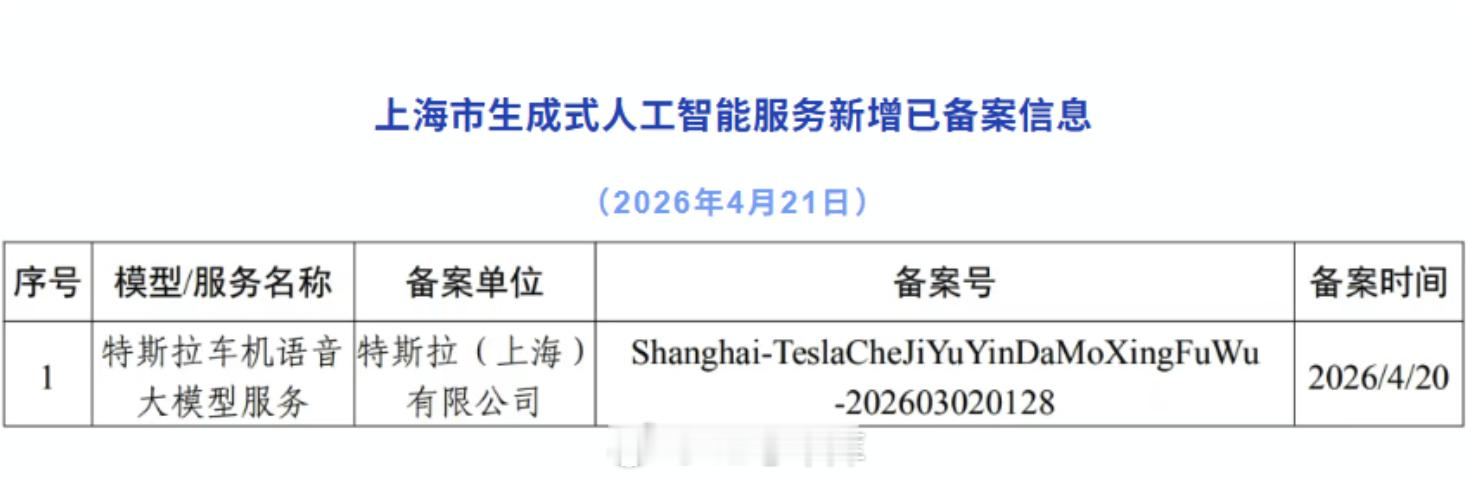 特斯拉车机语音大模型服务已于 4 月 20 日备案,备案单位为特斯拉(上海)有限公司。
