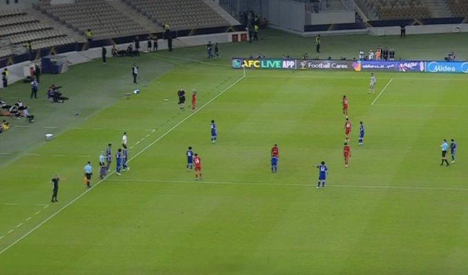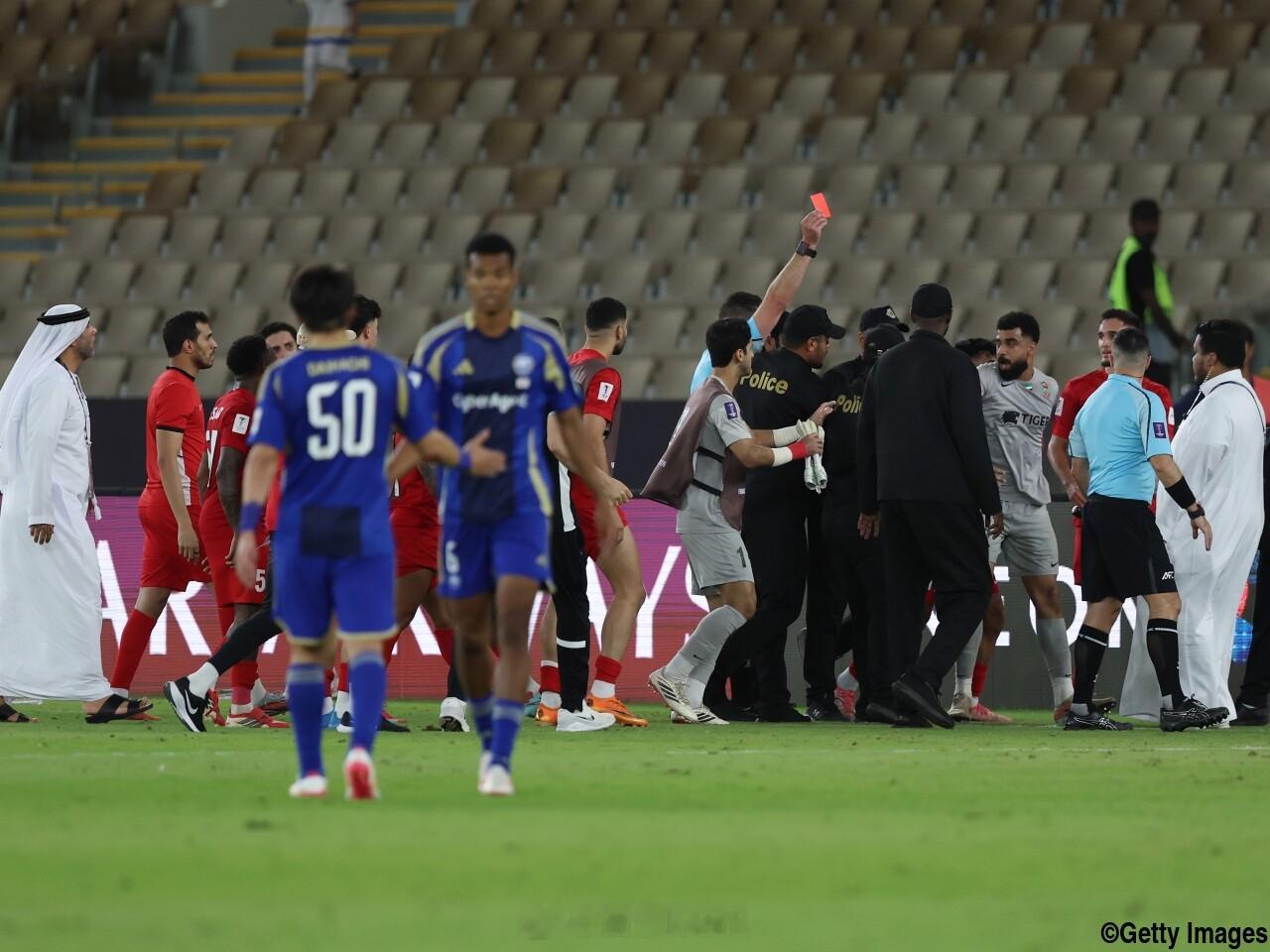 赛后迪拜青年国民抗议裁判多次判罚对己方不利,继续领红卡回家。