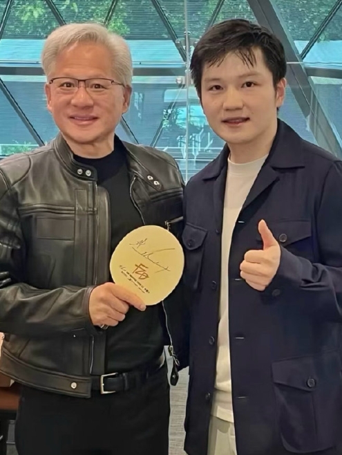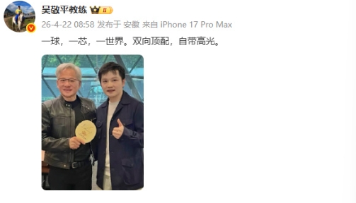 4月22日,吴敬平教练回应樊振东与英伟达创始人打球 :一球,一芯,一世界。双向顶配,自带高光。