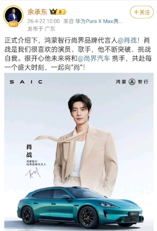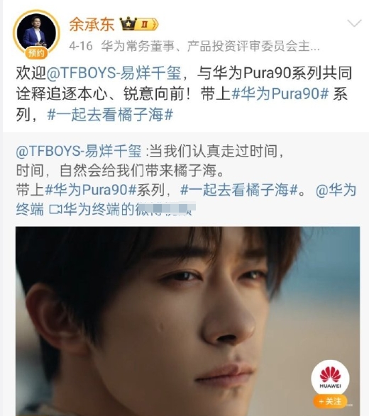 华为老总高兴的嘴都闭不上了,不但亲自预热,还正式官宣。另一个易烊千玺只是官腔转发。发肖战的微博文字抑不住的狂喜,这牌面只有肖战有啊!