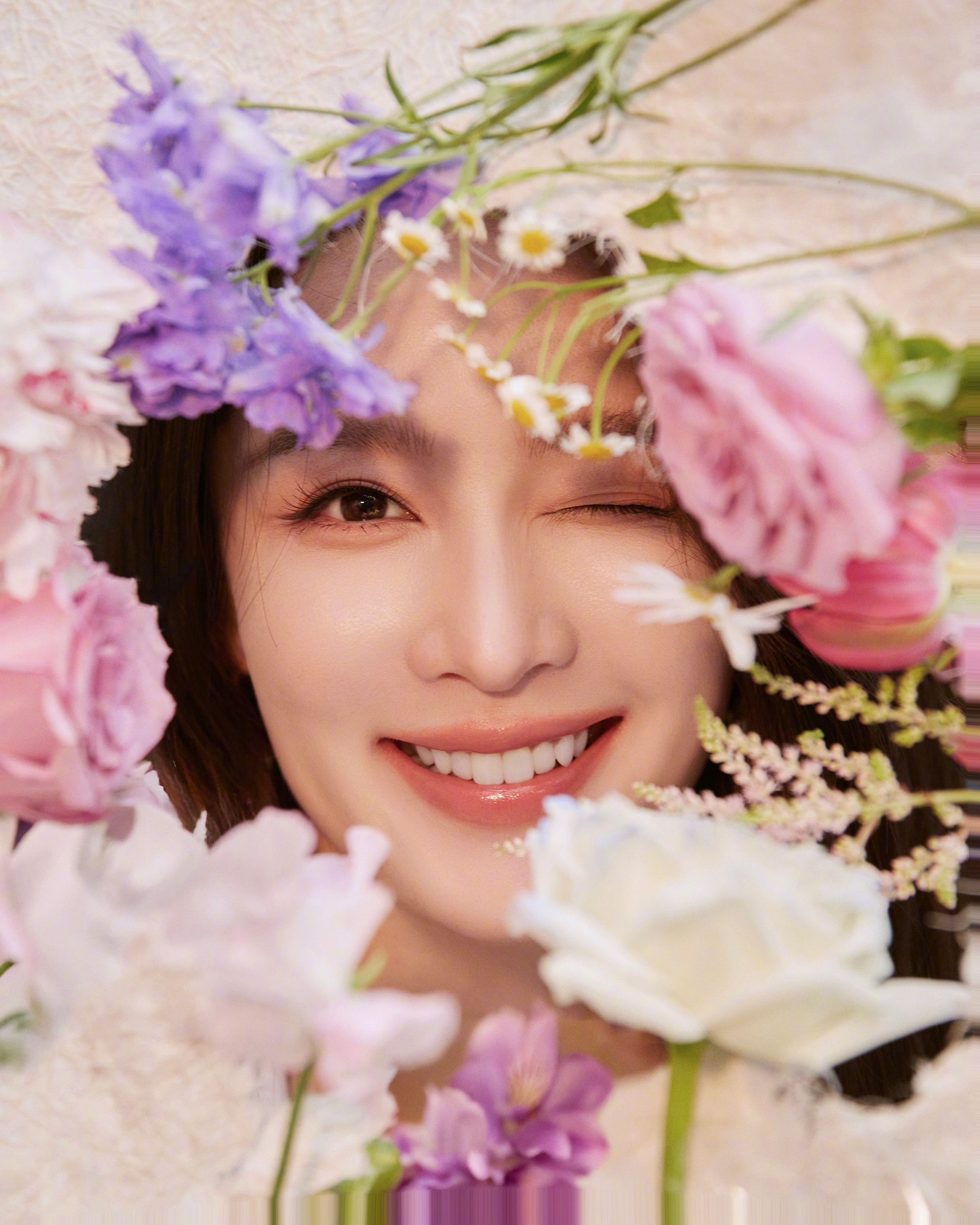 李沁一袭纯净白裙,坠入春日绿意与明黄的温柔画卷里。