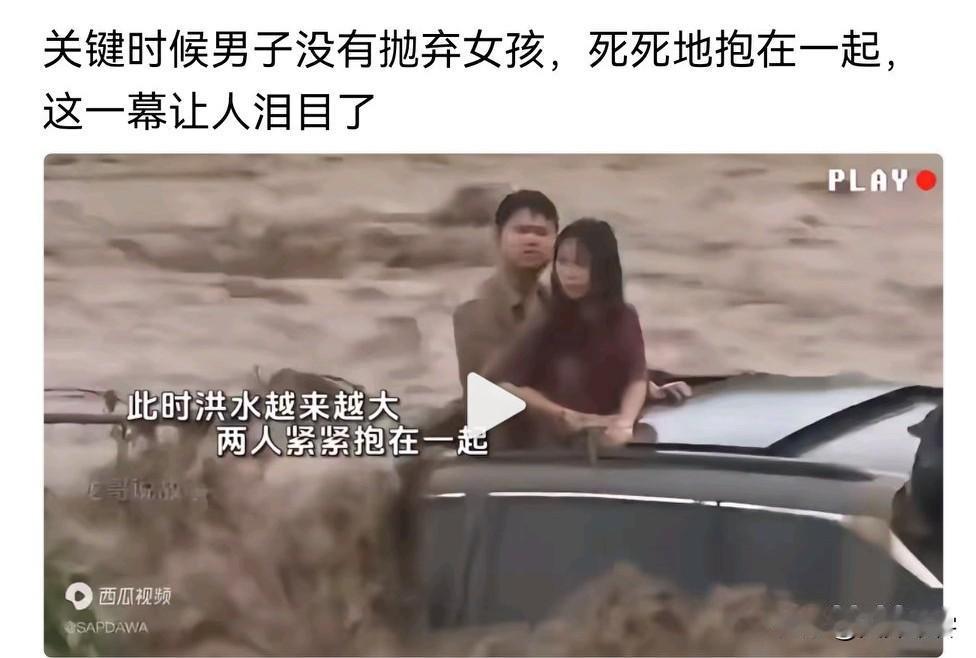 谁说世界没有真爱,这两位就是真爱。在生死关头,他们互相拥抱、互相鼓励,在无人机的帮助下,男子用绳捆绑好女孩后,让女子先走,在两岸救援人员的帮助下,女子成功获救。那么大的洪水,后走的人随时可能被洪水吞噬,但男子义无反顾的让给了女孩。可见男子对女孩的爱是刻在骨髓里的。可喜的是两个人都得救了。 没结婚就赶紧结婚吧,这个男子可以托付终身! 谁说夫妻本是同林鸟,大难临头各自飞的?这两位就不是,如果我遇到这种情况,我也会先救妻子,不救,那是没爱到深处。