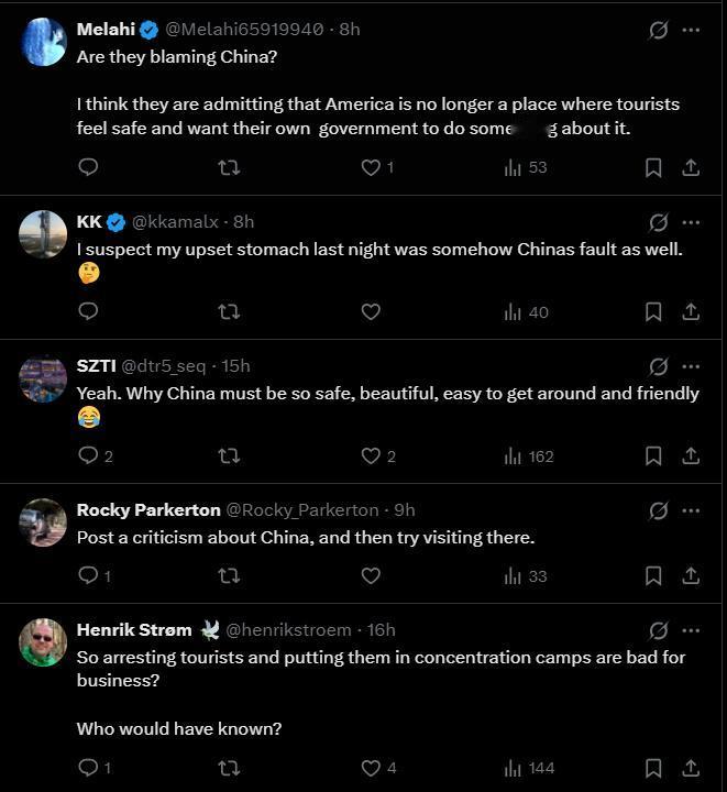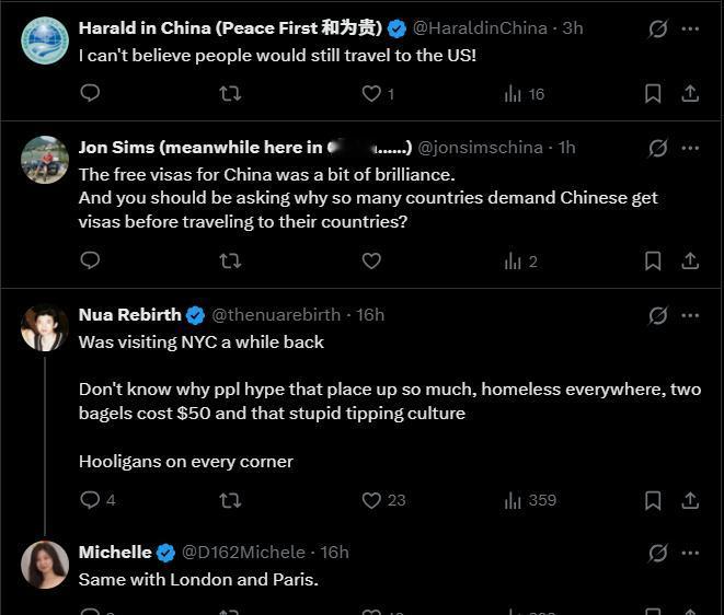 美媒把本国旅游业下滑、游客数量减少归咎于中国,抱怨“中国游客上升”导致美国失宠? 所以美国失去游客是中国的错吗? 我想全世界游客都更喜欢访问拥有世界级基础设施的国家,不是那种你一到就被抢劫和枪击的坑洼街头,而且在美国还得时刻准备面对美国政府无来由的骚扰式检查,时刻做好被随时遣送回去的心理准备,这谁受得了! 底下的评论就更扎心了: “前阵子我去纽约 真不明白为什么大家这么夸这个地方,到处都是无家可归者,两个白吉饼要50美元,还有那个愚蠢的小费文化,每个街角都有流氓” “我真不敢相信还有人会去美国旅行!” “抵达后确实可能被拘留和骚扰。甚至美国公民从海外回来时也会遇到这种情况。” “他们是在指责中国吗? 我认为他们承认美国不再是一个游客感到安全、希望政府采取行动的地方。” “(到达)然后被抢劫和枪击。美国政府会骚扰你,然后把你遣返回去。如果你通过了官方骚扰,那么你还得额外支付250美元才能进入美国。 你在进入美国之前就被抢劫了。” 看来打铁还需自身硬,一味地怪罪别人,并不是解决自身问题的好办法。