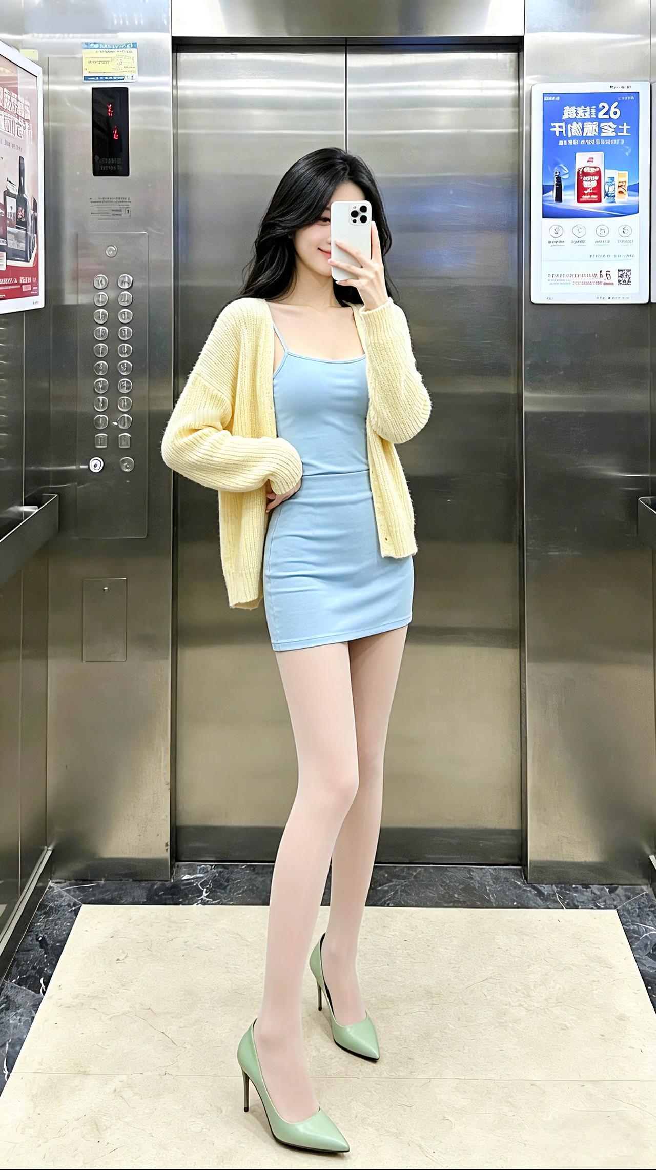 电梯间里,浅蓝紧身裙裹着柔媚的甜,鹅黄开衫一搭又添了松弛的温~同色系高跟鞋踩出精致,这种轻熟不艳俗的柔媚风你们爱了吗?轻熟风穿搭 高跟鞋 电梯拍照 大长腿