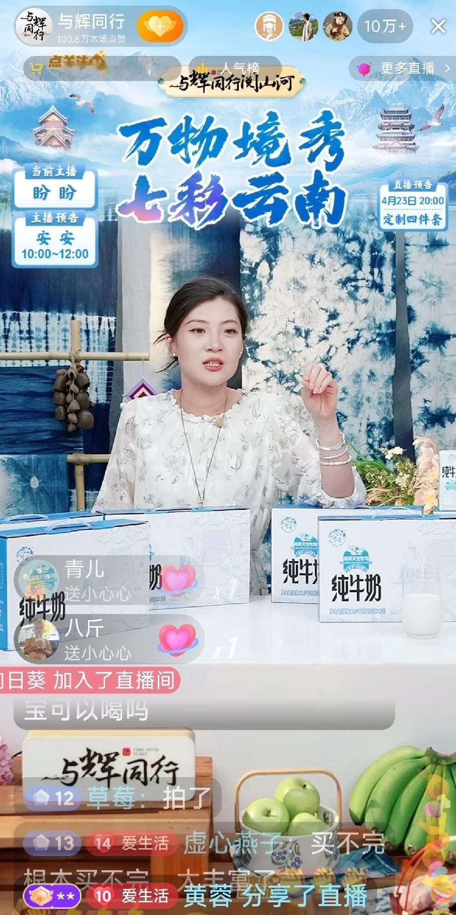 与辉同行在出发云南前连发的三篇文章,我是听了又听,真的觉得董宇辉是有多么的热爱这片土地,才是发自内心的美赞了咱们云南。真的是文化人,废话不多说,句句经典。 这次与辉同行云南行三天的时间,我觉得他们团队还是安排比较紧。今天早上与辉同行直播间是盼盼,中午场是安安,盼盼开播5分钟,直播间十万加,所带的都是云南好物,一小会就是千万加的直播销售,说明云南的这些产品好,与辉同行的粉丝们热情。当然看了一下所带的产品售价,性价比很高。感谢与辉同行董宇辉及团队成员。但这些都是双向的。期待接下来的时间给全国的人们带来更多的,更好的,性价比合适的云南出品的产品!