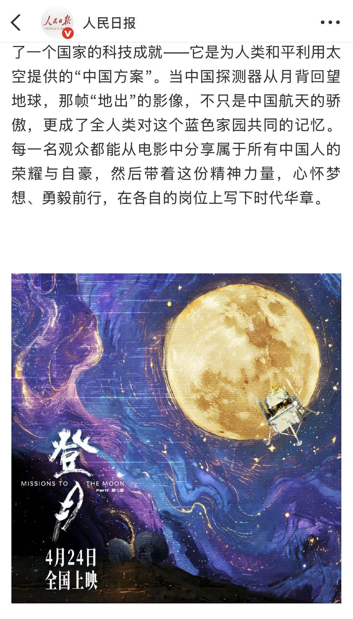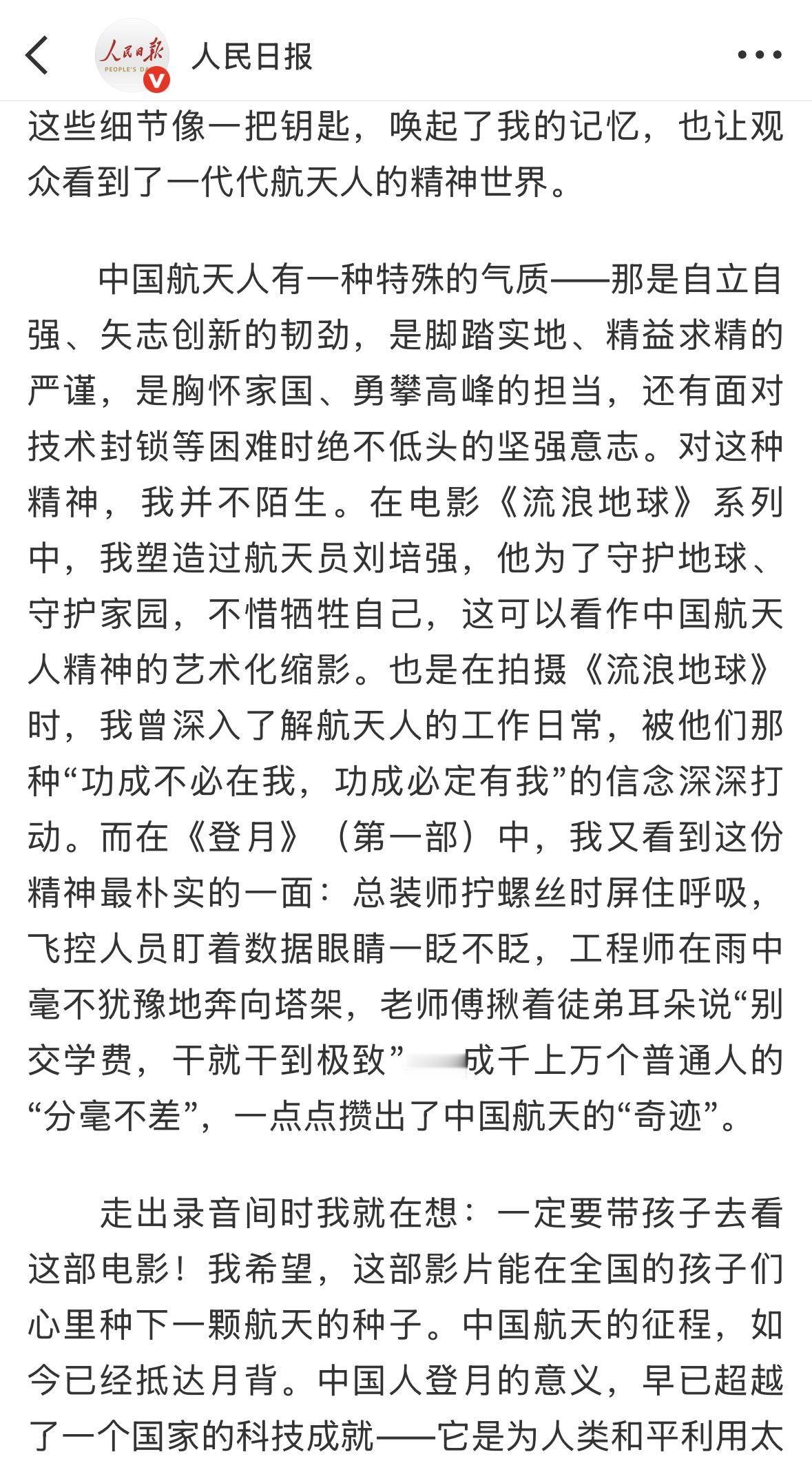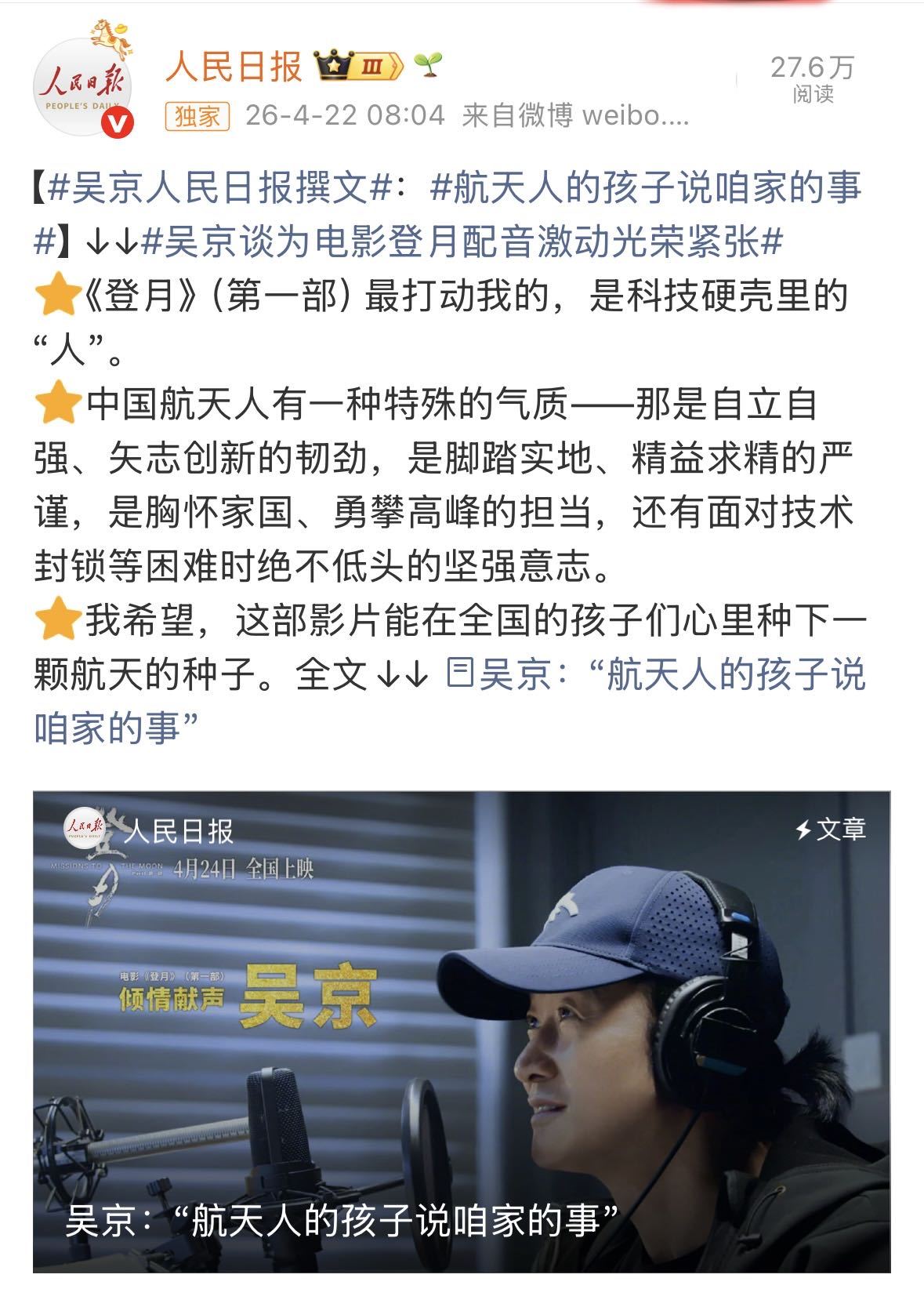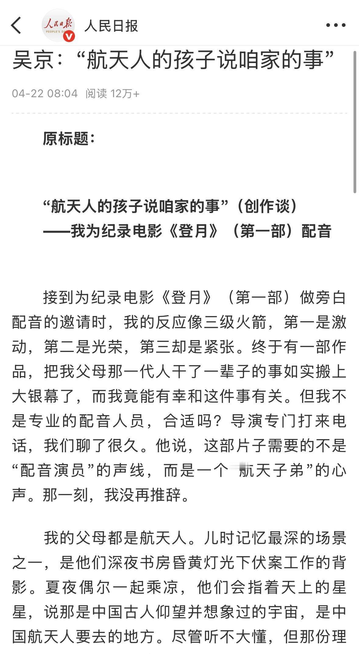 吴京人民日报撰文吴京人民日报发文谈登月吴京以航天子弟视角撰文,深情讲述父母辈默默扎根航天的峥嵘岁月,配音时反复打磨只为还原初心。4月24日,走进影院看《登月》,向每一位默默奉献的航天人致敬。