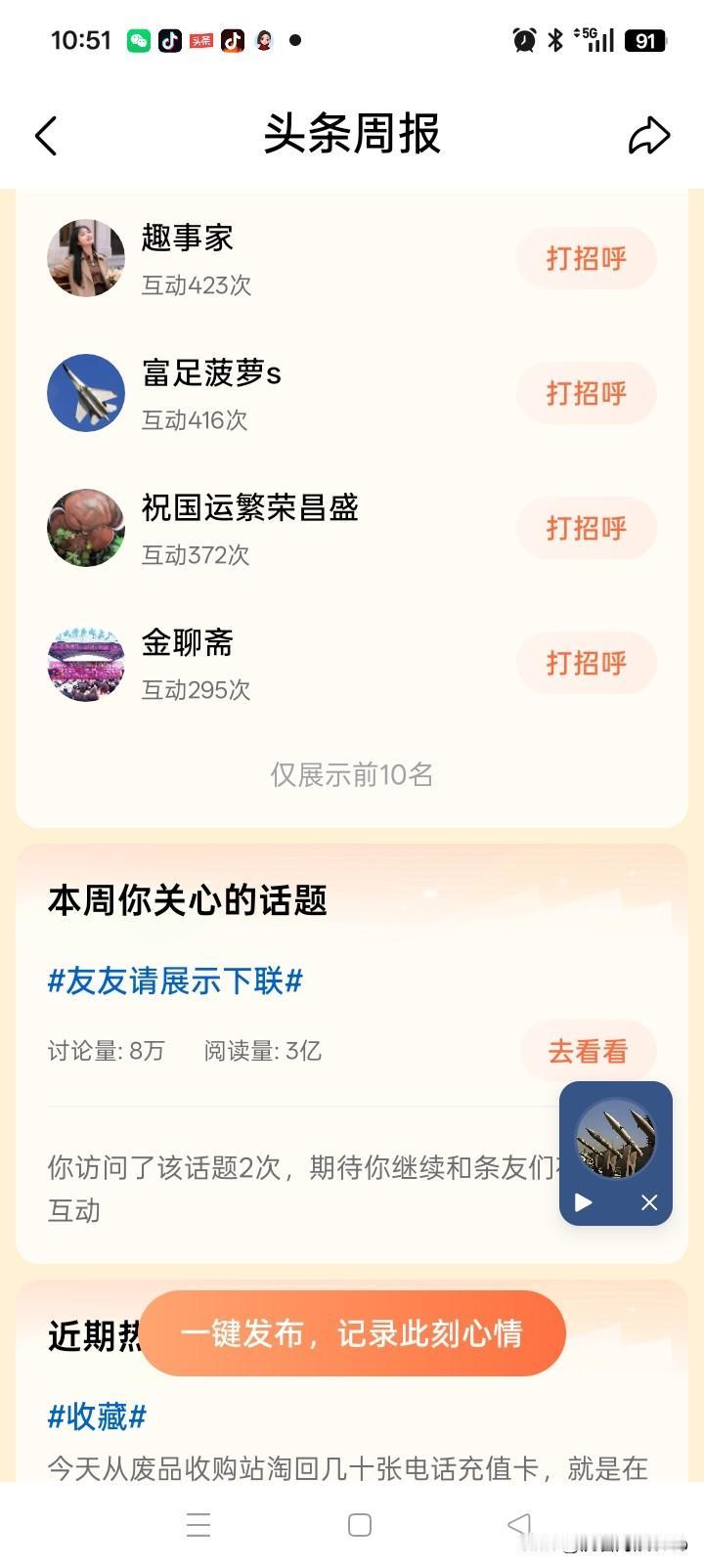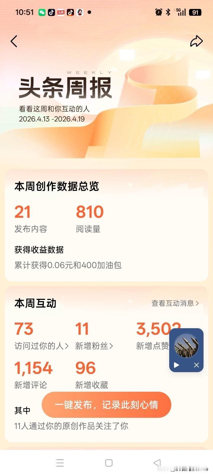 分享我的头条周报![耶] 很荣幸!又收到了头条号推送的“上周周报”! 上一周,我的心情跌宕起伏。说实话,明知道我的担心是瞎子点灯——白费蜡,但还是心有戚戚。什么事情呢?就是中东战争给中国给世界造成的伤害! 一是成品油价涨了。给老百姓增加了生活成本,也给国民经济的发展带来负面影响;二是小日子小菲菲趁机兴风作浪。美菲军演、小日子第一次出兵菲律宾,有美国这个棍,又搅动了东亚风云;三是世界航运变局影响大。物流成本上升,传统线路阻塞,中国进出口贸易受到冲击;四是美以伊战争久拖不决。是否外溢,全世界人民提心吊胆,我也担心给中国的和平发展环境造成破坏。 虽有担心,但我相信中国政府有智慧、有能力化“危”为“机”,为中国谋发展,为人民谋幸福。 感谢师友们一以贯之的点赞支持!谢谢您!祝福您和家人幸福安康每一天![作揖][福][耶]