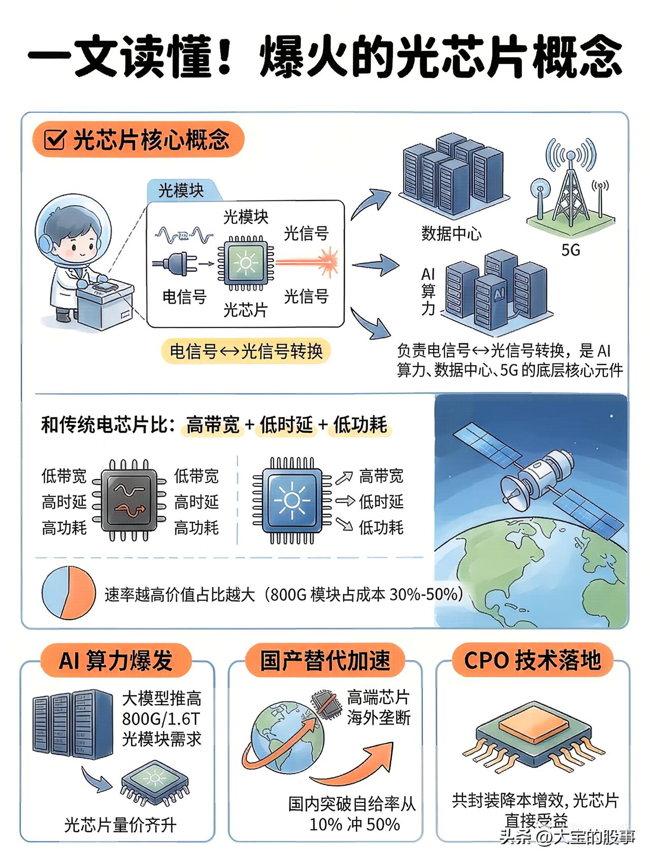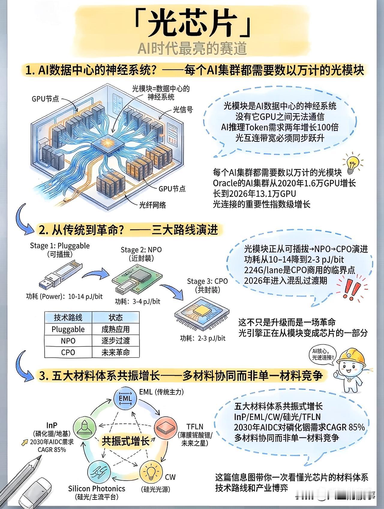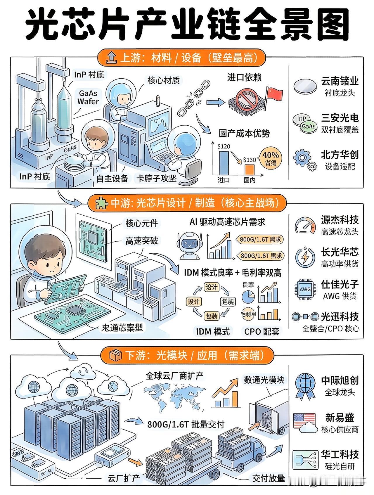 别再死磕光模块!AI真正的王炸赛道,被90%的人忽略了💥 整条AI算力产业链里,壁垒最高、卡脖子最狠、替代空间最大的核心,永远是光芯片 🔥 国产光芯片核心玩家 第一梯队 - 光迅科技:A股产能断层第一,200G高端芯片全力研发,成熟产品已批量商用 - 华工科技:产能稳居第二,提前锁定1.6T下一代硅光芯片赛道 - 源杰科技:400G/800G已经批量出货,多款1.6T芯片完成客户验证,放量在即 中坚力量 - 新易盛:硅光芯片研发量产全线提速 - 博创科技:全系列高速激光芯片全覆盖 - 仕佳光子:800G光模块配套芯片实现大规模销售 低位潜力标的 - 永鼎股份:打通光芯片-器件-模块全产业链闭环 - 长光华芯:多款100G芯片年内量产,200G研发进度超预期 - 跃岭股份:参股核心原厂,深度绑定有源光芯片赛道 ⚠️风险提示:本文仅为市场复盘分析,不构成投资建议,市场有风险,投资需谨慎。 今日A股 股市分析 股市点评