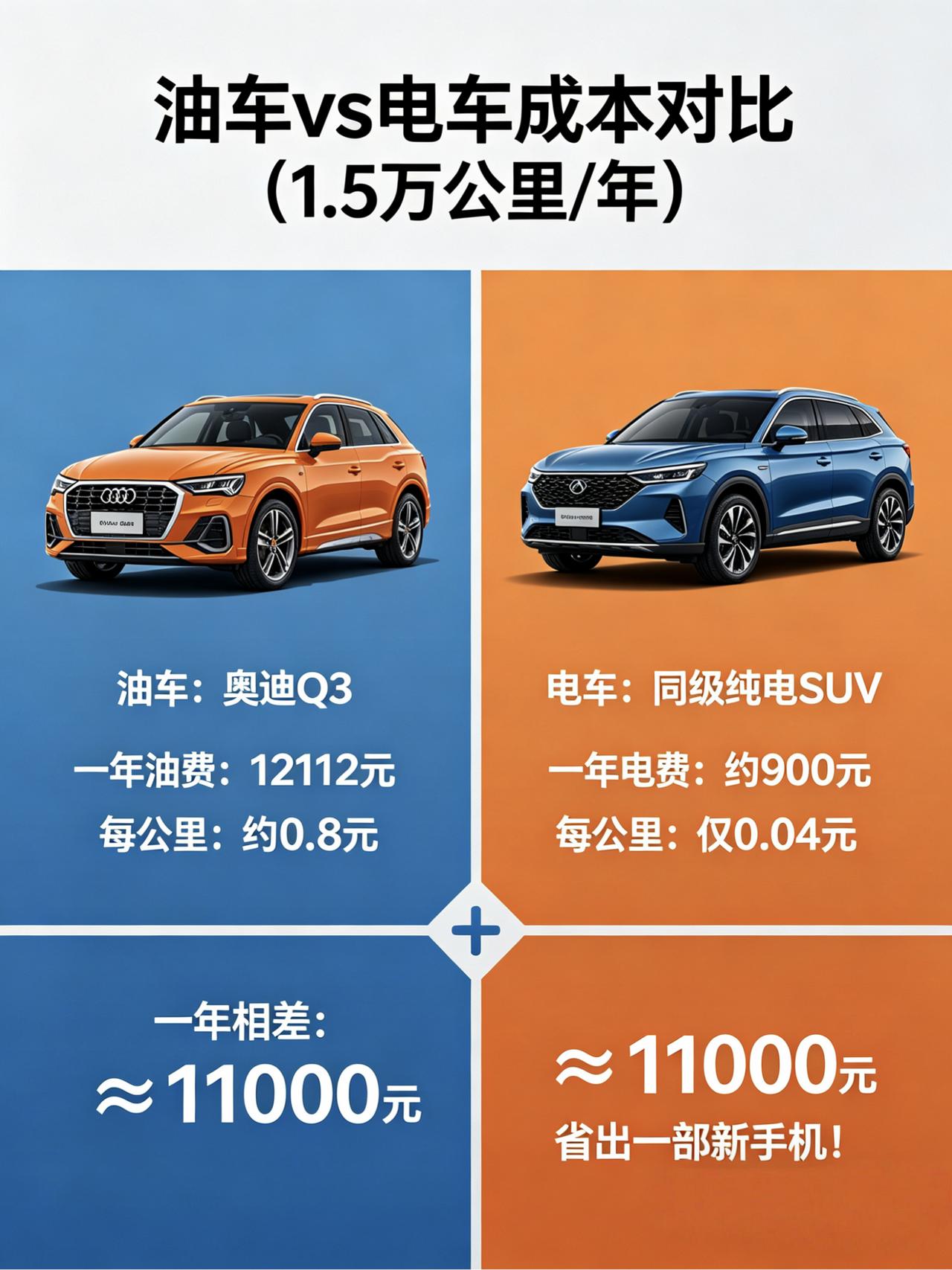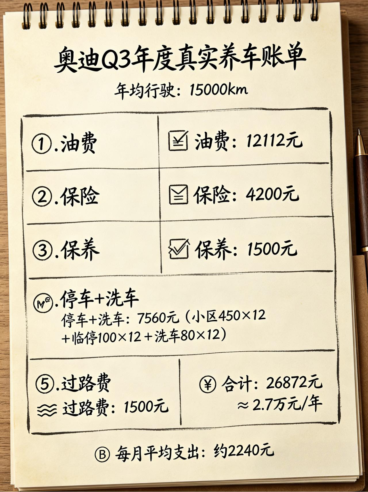 开奥迪Q3一年要花多少钱?算完这笔账,我连奶茶都戒了! 都说车养起来贵,但具体贵在哪?拿我这台2.0T的奥迪Q3为例,今天把家底翻出来,算算真实的一年养车成本。不算不知道,一算吓一跳,这钱要是省下来,每年都能换个最新款iPhone! --- 📋 我的年度真实账单(按每年跑1.5万公里算) 1. 油费(大头中的大头):市区通勤为主,百公里真实油耗9.5L-10L(别信表显,那是快乐表)。加95号油,按目前8.5元/升计算,一年油费 = 15000 ÷ 100 × 9.5 × 8.5 ≈ 12,112元。每月光油钱就1000块起步。 2. 保险费:第二年开始没出险,交强+三者200万+车损,优惠后约4200元/年。第一年新车在4S店被强制买,花了将近8000,太坑了! 3. 保养费:小保养去外面做600,大保养去一次2000+。平均下来一年算1500元。 4. 停车+洗车:小区月保450元,公司停车免费,加上周末临停平均每月100元,洗车一个月两次每次40元。一年花费 = (450+100)×12 + 80×12 = 7,560元。 5. 过路费:偶尔自驾或回老家,一年大概1500元。 💰 总计:12,112 + 4,200 + 1,500 + 7,560 + 1,500 = 26,872元 📆 每月平均支出:约 2,240元 结论:开这台Q3,每年花掉2.7万,每月固定支出2240元,这还没算轮胎磨损、违章罚款和折旧。 --- ⛽ 油费 VS 电费:如果换成电车能省多少? 假如同样一年跑1.5万公里: · 油车(我的Q3):百公里成本 9.5L × 8.5元 = 80.75元,每公里约0.8元 · 电车(同级别SUV):家用充电桩0.3元/度,百公里电耗20度,成本6元,每公里仅0.04元,一年电费约900元 · 对比:开电车一年补能费用仅900元,而我的Q3要1.2万,一年能省1.1万,相当于白捡一部手机! --- 💡 过来人的省钱心得 1. 加油窍门:别等油表亮了再加。用好平台优惠(比如高德、滴滴加油),每升常能省3-5毛。加油送洗车券,洗车钱也能省一笔。 2. 保险避坑:别买“指定专修厂”这种捆绑项。直接电话车险或支付宝比价,哪家返点高选哪家。驾乘险单独买意外险更划算。 3. 停车技巧:公司停车免费已经省了一大笔。去商场用积分抵停车费,去医院或热门商圈停附近老小区或办公楼,比停车场便宜一半。 4. 心态放平:既然选了豪华品牌,油费和保养省不了太多,但停车、洗车、保险这些软性开支,稍微上点心一年省5000块轻轻松松。 --- 看完这个账单,你还觉得养车轻松吗?你的车每月花多少钱?晒出来比比谁更省! 我的用车账单 油电成本对比