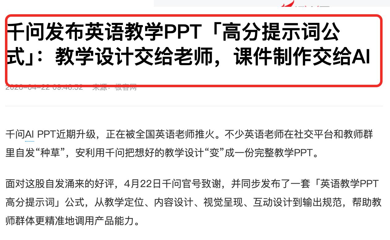 怪不得海外媒体酸中国的科技,进步确实太快了! 美国《财富》杂志前段时间发文称,在当前全球人工智能竞争日趋激烈的背景下,中国正展现出越来越突出的综合优势。 这篇报道指出中国优势分别是,电力资源充沛、制造业体系发达、开源模型领先。 很显然面对中国的AI发展速度,外媒这是有点酸了,毕竟以往的时候但凡是和科技相关的,他们都会猛吹自己有多猛。但现在形势出现反转,中国的AI开始领先了。 除了外媒说的这些资源、体系方面的东西,咱们的AI在应用方面更是走到了前面。 最近社交媒体上有个事就很有代表性,一大批的老师用千问来做PPT,尤其是英语老师应用频率非常高,大家的热情甚至一度让千问做PPT需要排队。 千问AI的PPT能力被大家看中,主要是千问PPT Agent升级了一波之后,做PPT的能力非常强大,并且所有人用它还都是免费。 具体来看,升级之后的千问,在做PPT时,不管你的内容是全中文还是全英文,亦或是中英混排,它都能精准识别与排版。 为了匹配专业领域的要求,千问还对职场、商业、教学、医疗、学术科研及技术研发等高频场景,进行了专项优化,并融合了超10万套高质量模板库,通过庞大的知识储备,可以很好满足各类专业内容的需求。 有了这些能力之后,大家现在做PPT用千问,只需要给它几张图,或者一个文档,它就能按照你的要求1-3分钟内帮你生成一个专业的PPT。 PPT的能力,代表的是解决实际问题的能力,AI的终极意义就在于服务于社会,提高效率。 很显然,以千问为代表的中国AI在这方面已经走出了坚实的一步,按照这种发展速度,未来一定会在更多场景、更多领域实现AI赋能,从而推动中国AI走向更高的层级。
