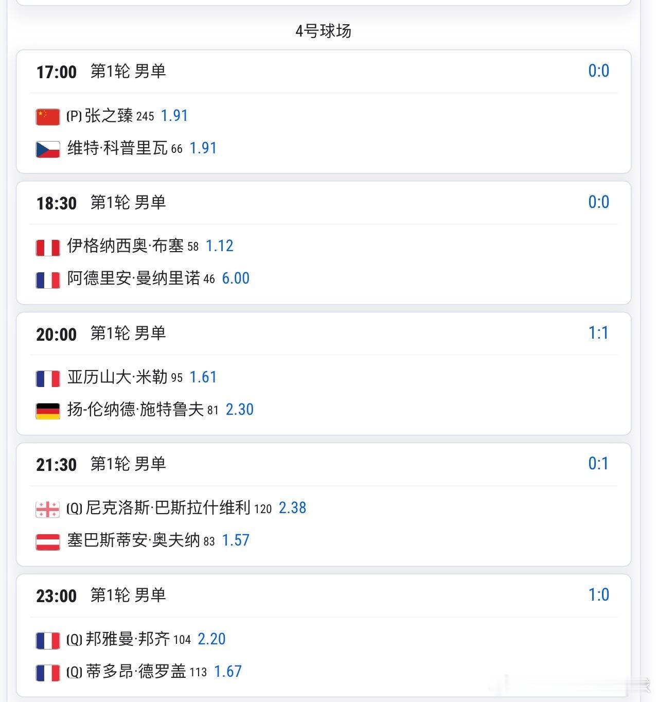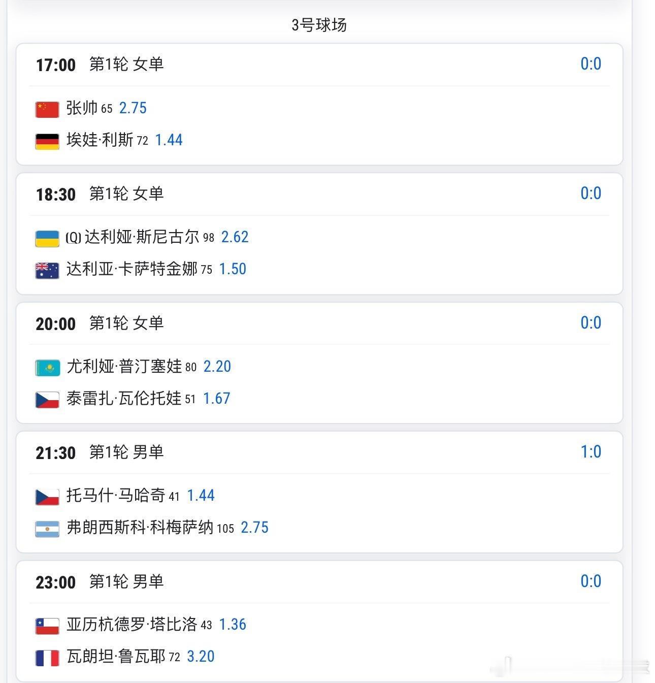 17点张之臻🇨🇳vs科普里瓦🇨🇿17点张帅🇨🇳vs利斯🇩🇪