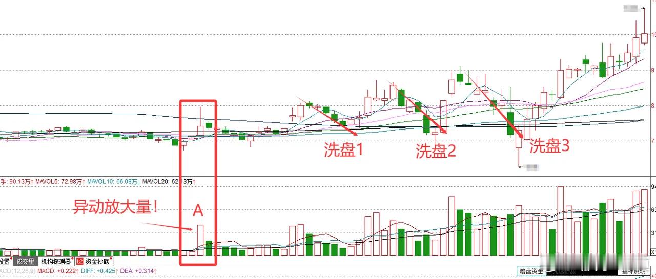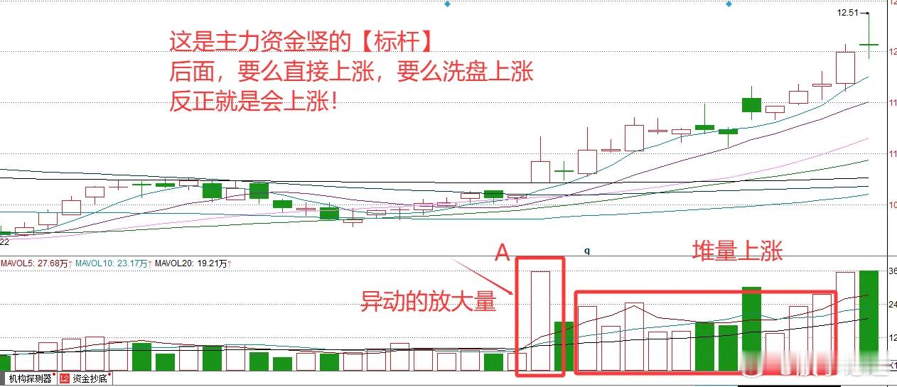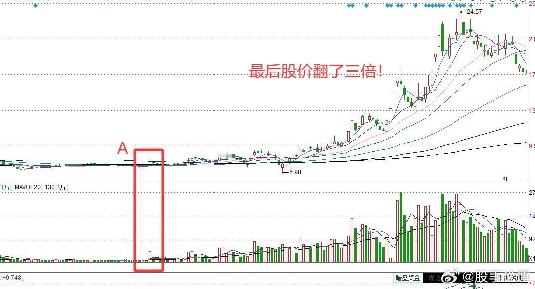 从我们技术投资者来看,股票在启动大行情之前,往往会表现出几个特征。其中最重要的那个特征,它就是“放大量”。很多同学们喜欢看MACD、布林线、KDJ等指标,但是这些指标统统都有滞后性。而且都可以被主力资金操纵,做出来你想看到的或者你不想看到的形态去诱骗你。唯有成交量这个指标,是比较难骗人的。成交量突然的放大,大概率是由主力资金介入到这支股票里面造成的。 【举一个非常典型的例子】大家来看图1,我标注的A区域,就是一个非常明显的异动放大量。出现了这样的放大量之后,这个股票有两种可能性:要么就是连续上涨给拉升起来了;要么它会进行洗盘,洗完了之后才会上涨。不论是前者还是后者,最后的结果都是大概率上涨的。因为放大的成交量都是主力资金进去的真金白银,这些都是主力资金的成本,在没达到它想要的结果之前,是不会轻易善罢甘休的。所以,在放大量之后,你一定要密切关注这支股票的走势! 【再看一个量能放大之后洗盘的例子】大家看图2,同样是A点标注的区域,成交量能形成非常大的放量,但是在这次放量之后,主力资金在拉升之前进行了3次洗盘。在这3次洗盘的过程中,主力利用散户追涨杀跌icon的特性,吸收了足够的筹码,所以后面的结果就是,股价在后面的拉升当中翻了三倍(如图3)。这个时候回头来看,A点的区域,就恰好是这只股票开始启动的那个位置。 【量能的集中放大,为什么一定是主力资金的行为?】因为散户是难以形成“合力”的。为什么这么说呢?因为散户的信息都是相差很大的,并且每个人的投资方法也不一样。在某个股票没有公布利好之前,即便有一批懂技术的散户都看中了这支股票,他们所选择的买点也会不尽相同,所以这个股票的成交量不可能被这些散户在某一天集中地、有计划地推升。这样就解释了为什么股价在爆发之前,往往会出现成交量的大幅异动——因为这个异动是由主力资金造成的,而主力资金是有能力在后面抬升这个股票的股价的。实时热搜创作激励计划今日看盘